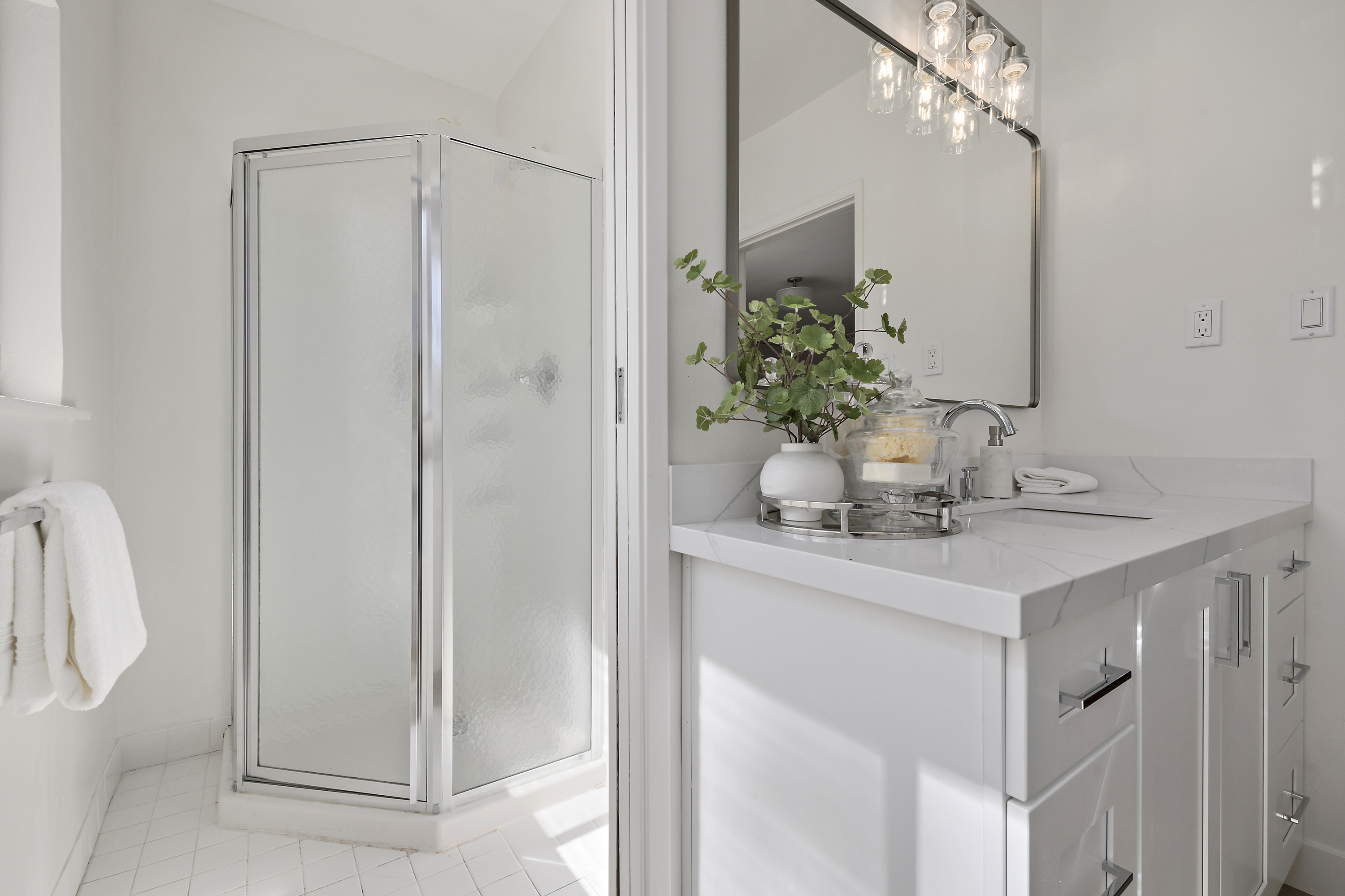 Primary Suite Retreat Features Stall Shower and Quartz Countertops