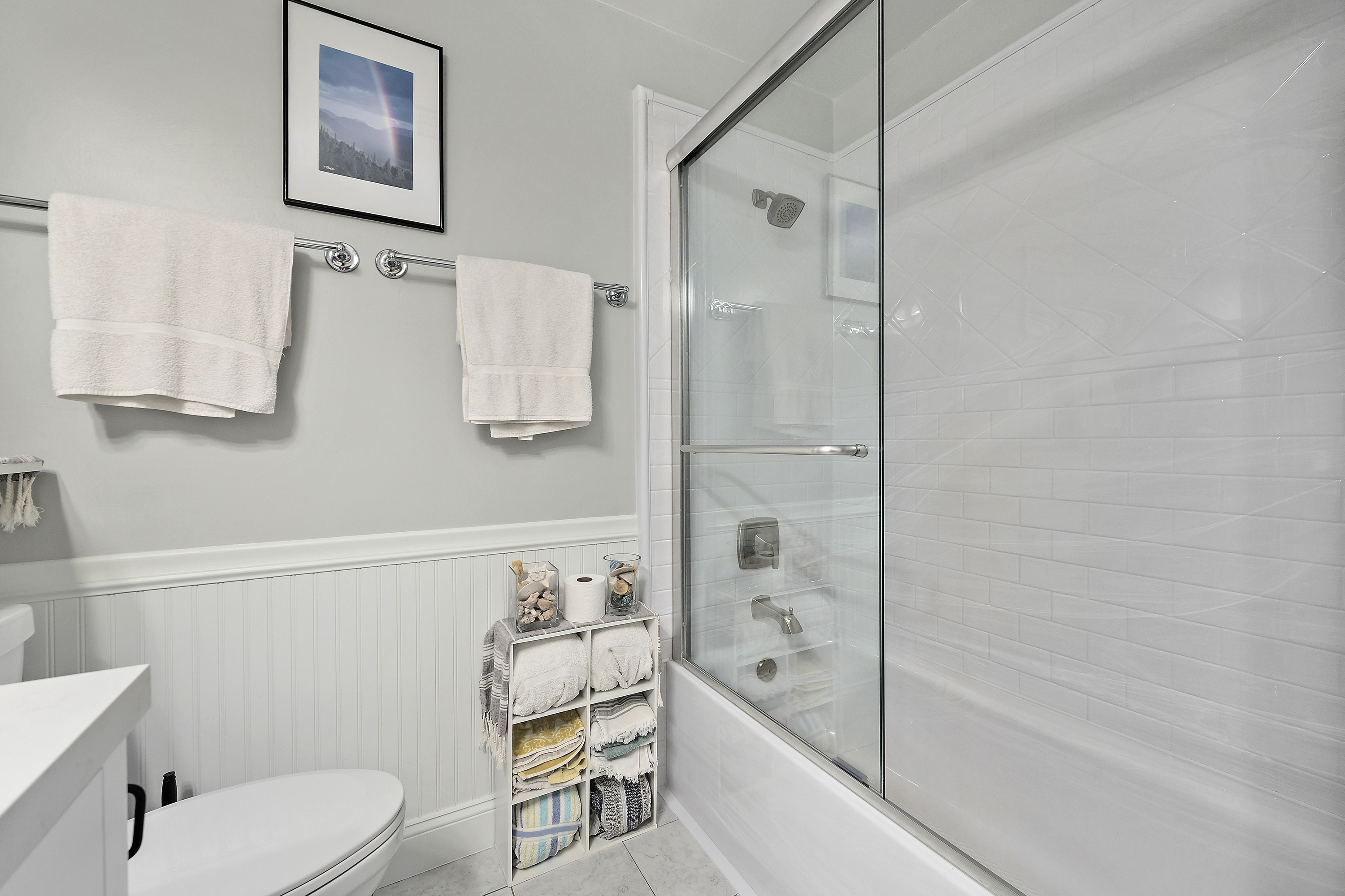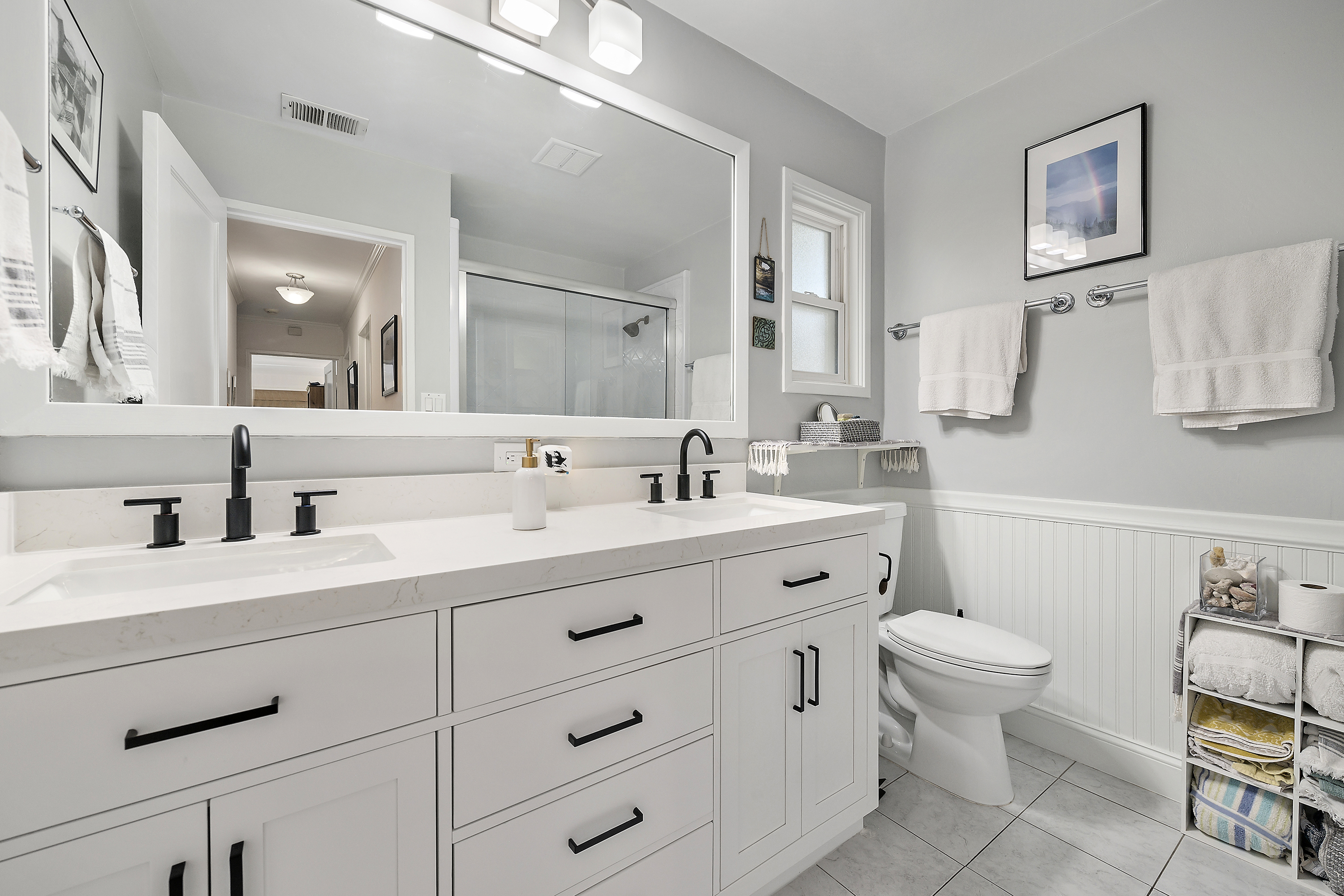 Primary Suite Retreat Features Double Sinks, Shower Over Tub, and Walk-in Closet