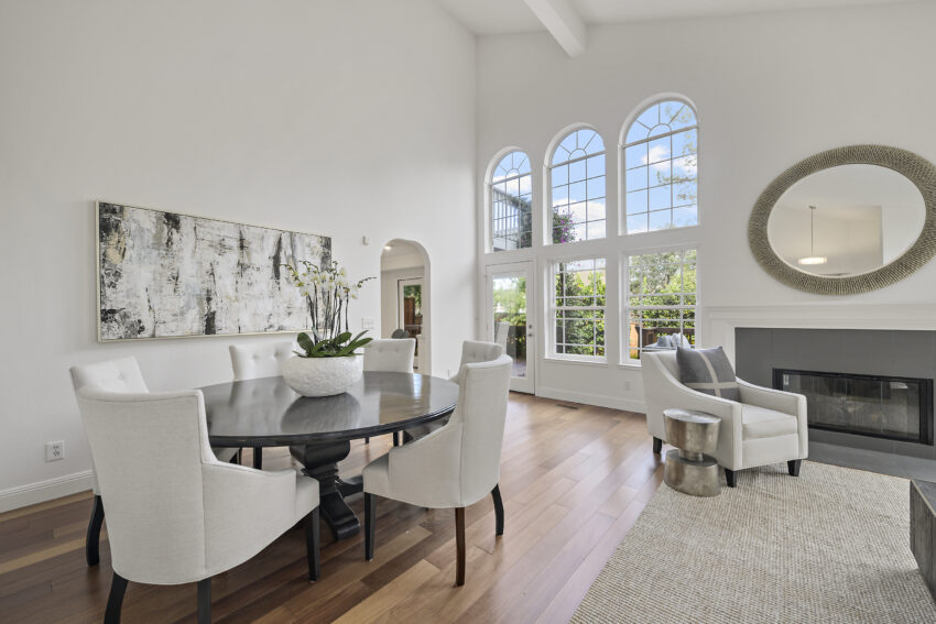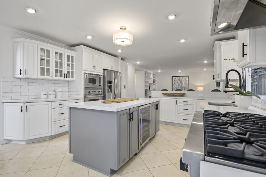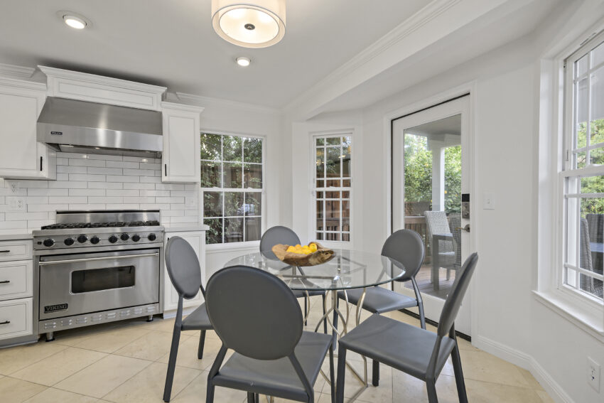 - Chef's Eat-in Kitchen with Center Island, Breakfast Bar, and Viking Appliances Opens to Family Room with Fireplace