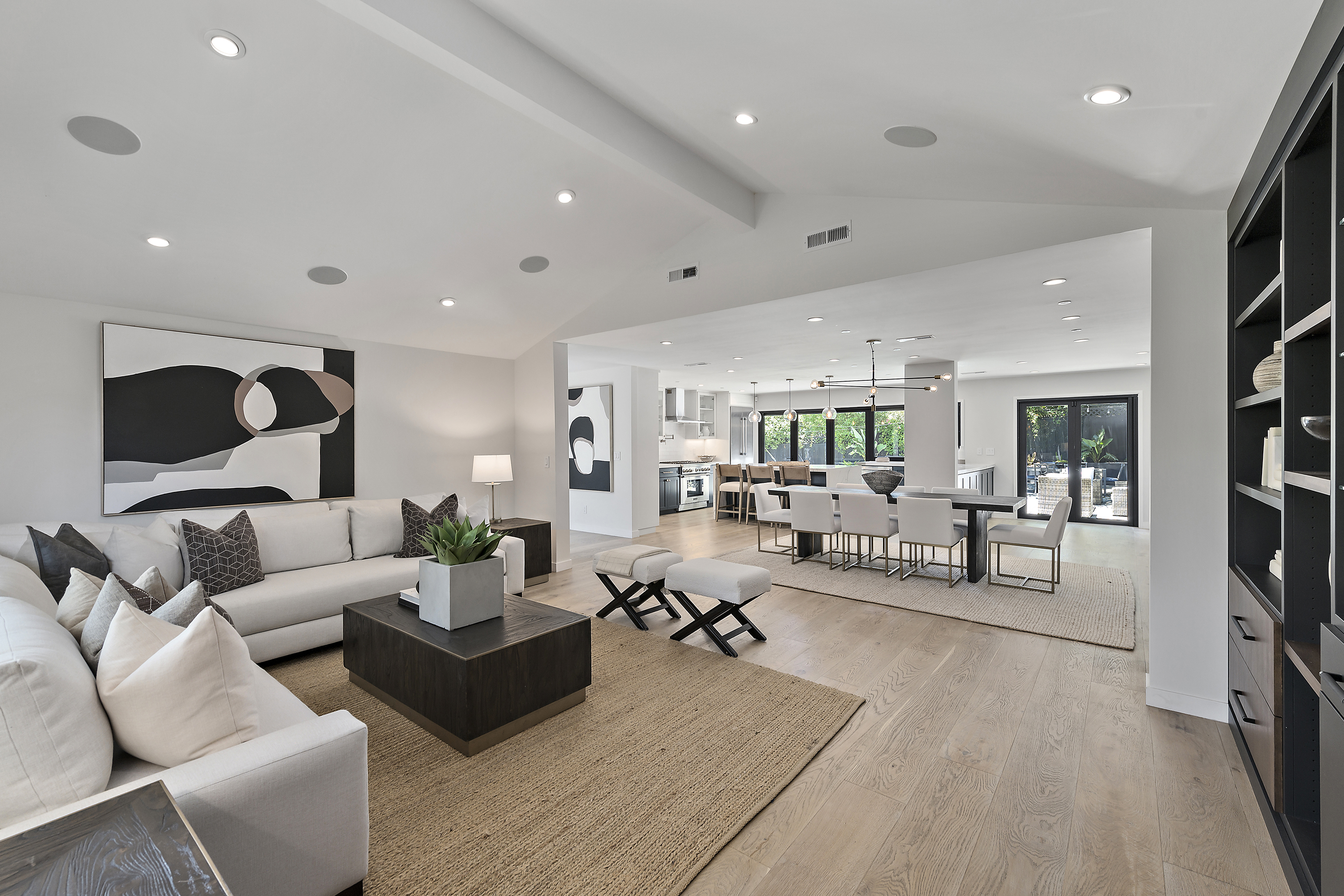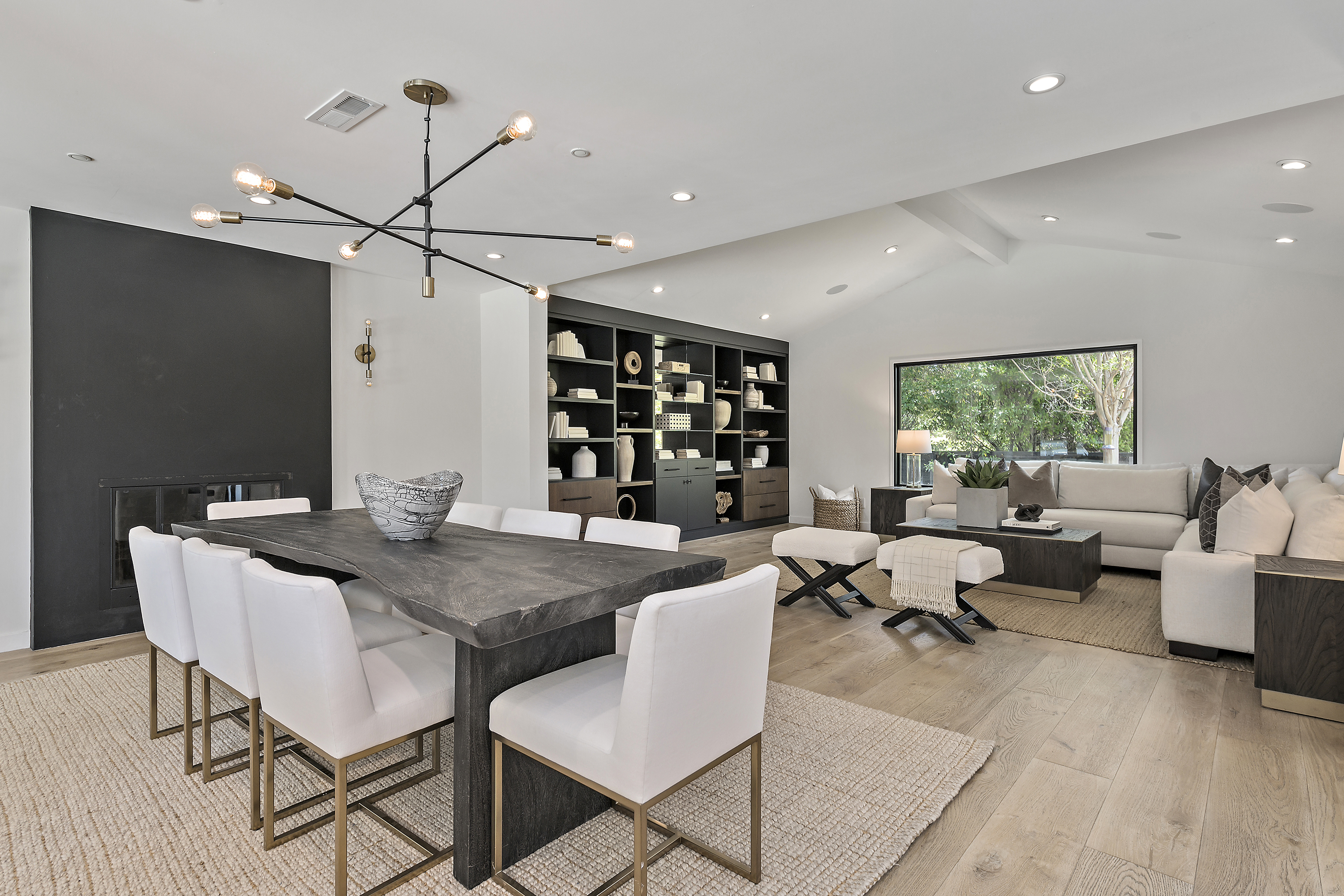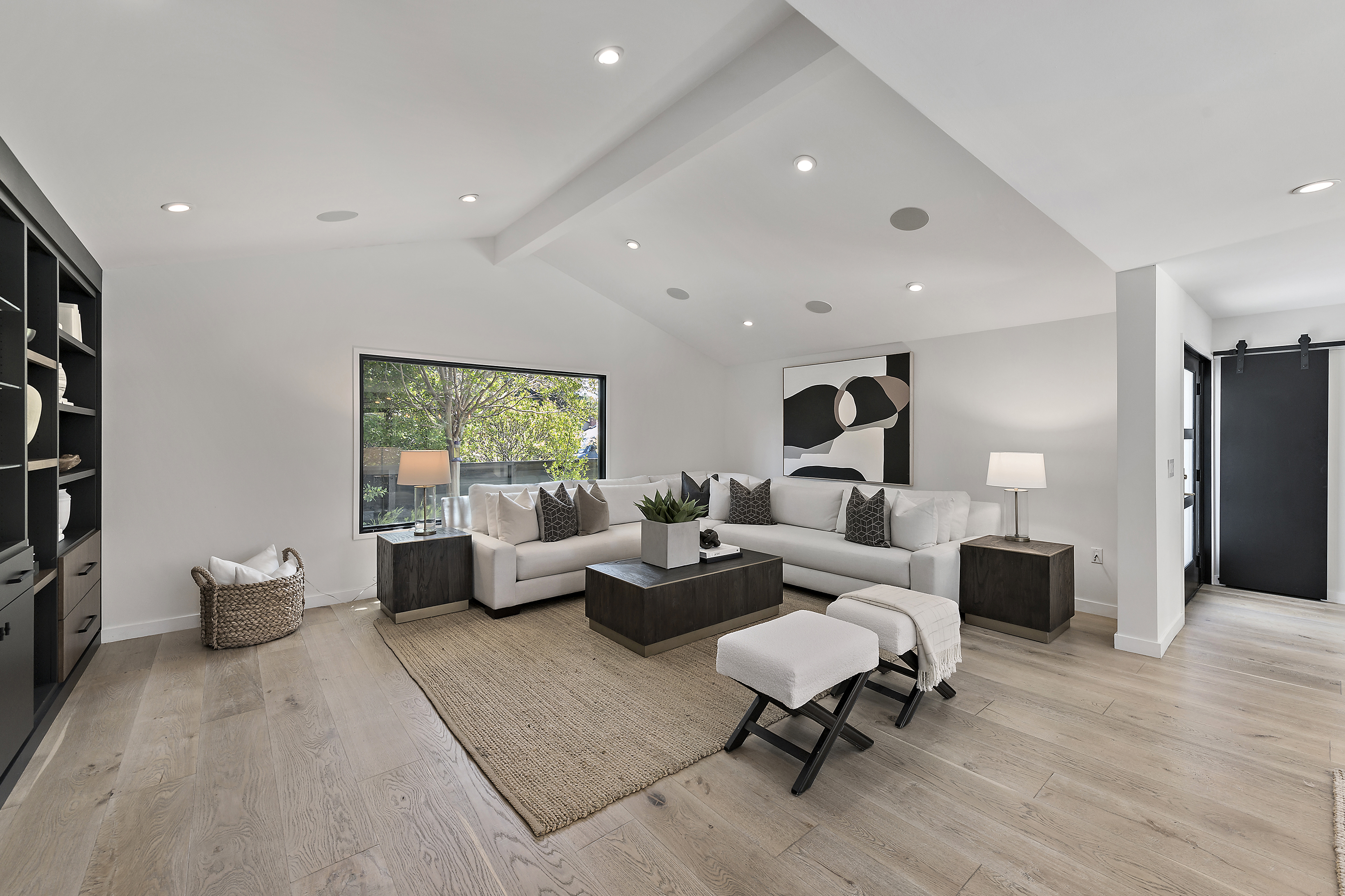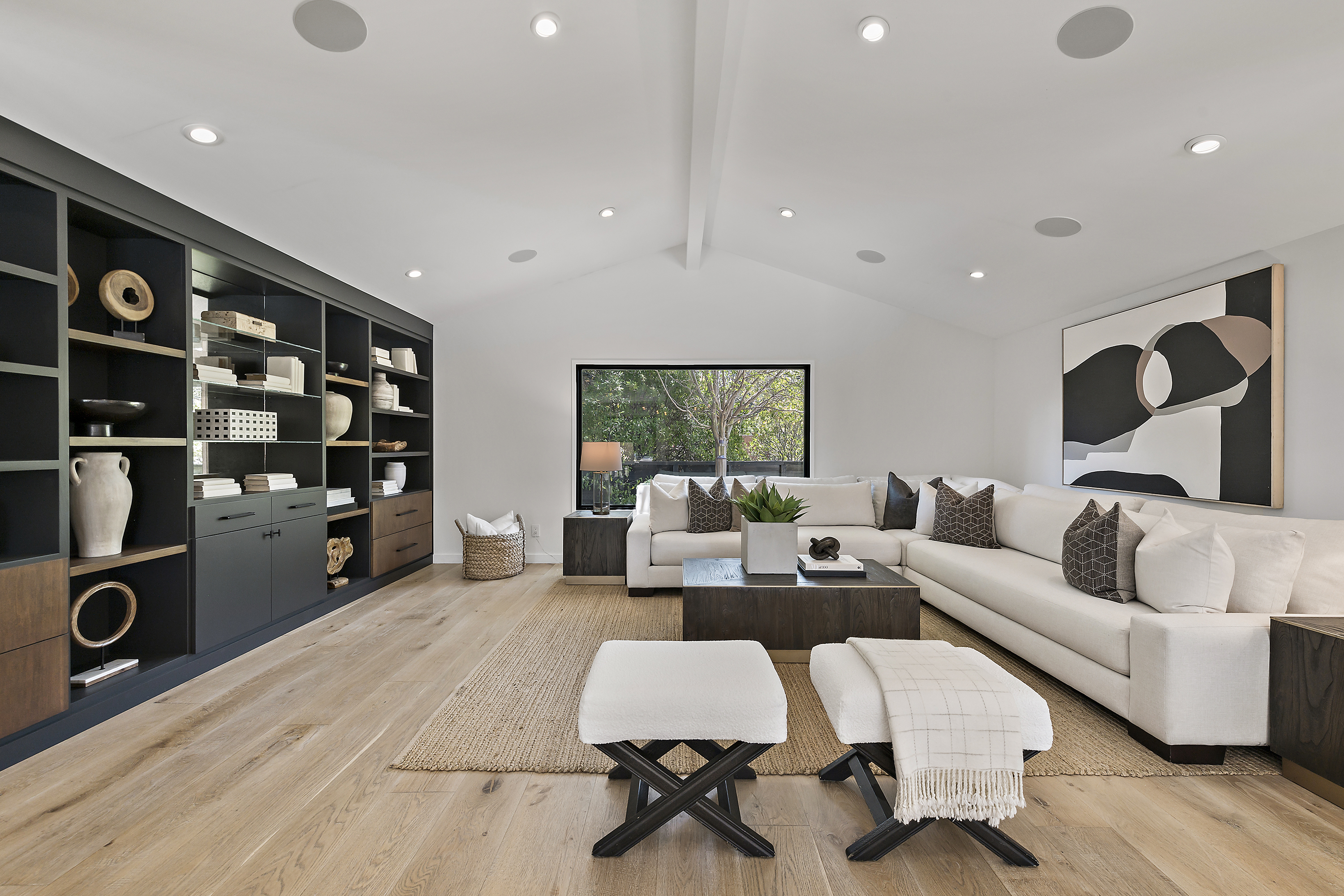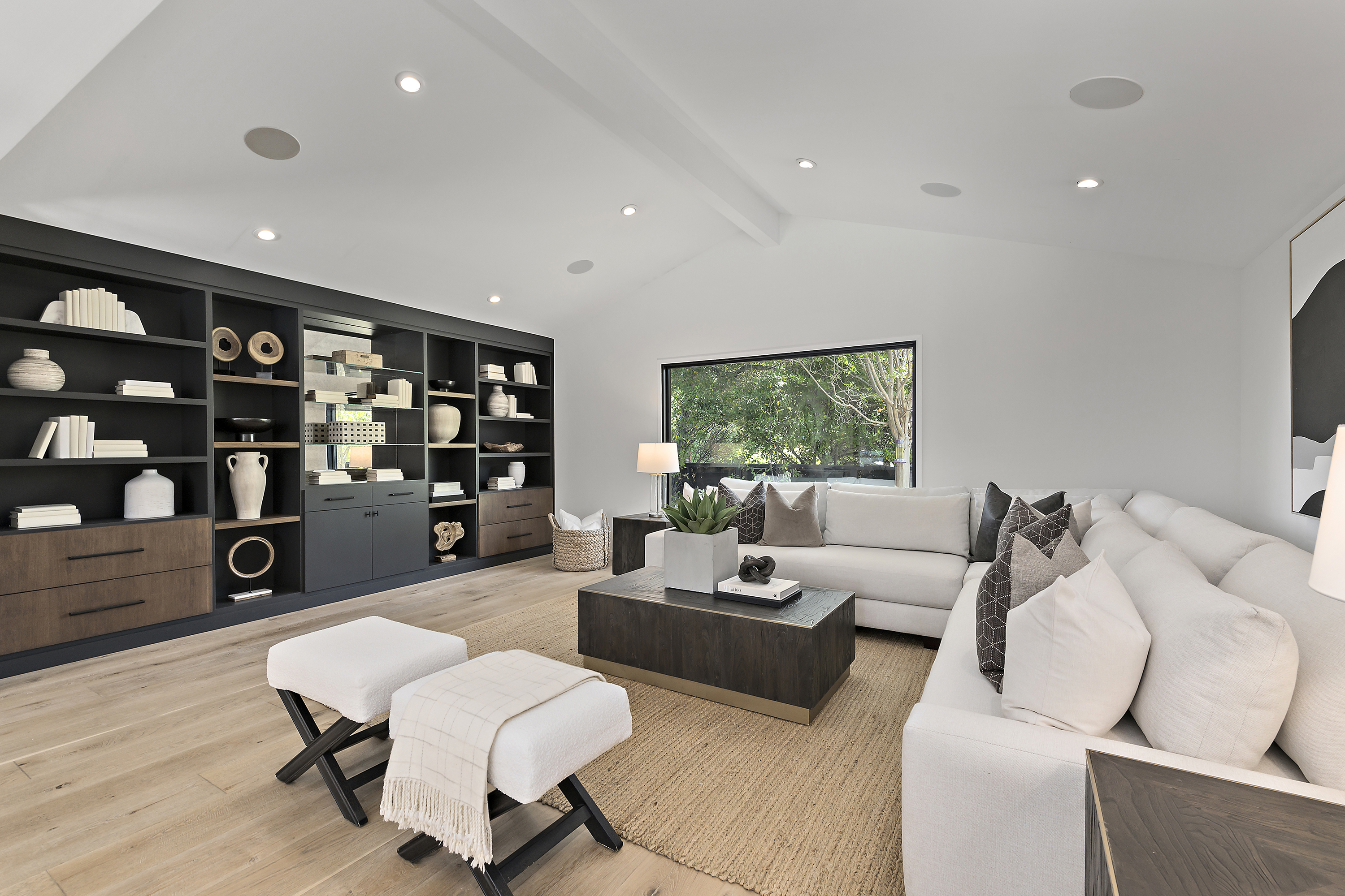 Elegant Living Room with Vaulted Ceilings, Fireplace, and Built-in Cabinets