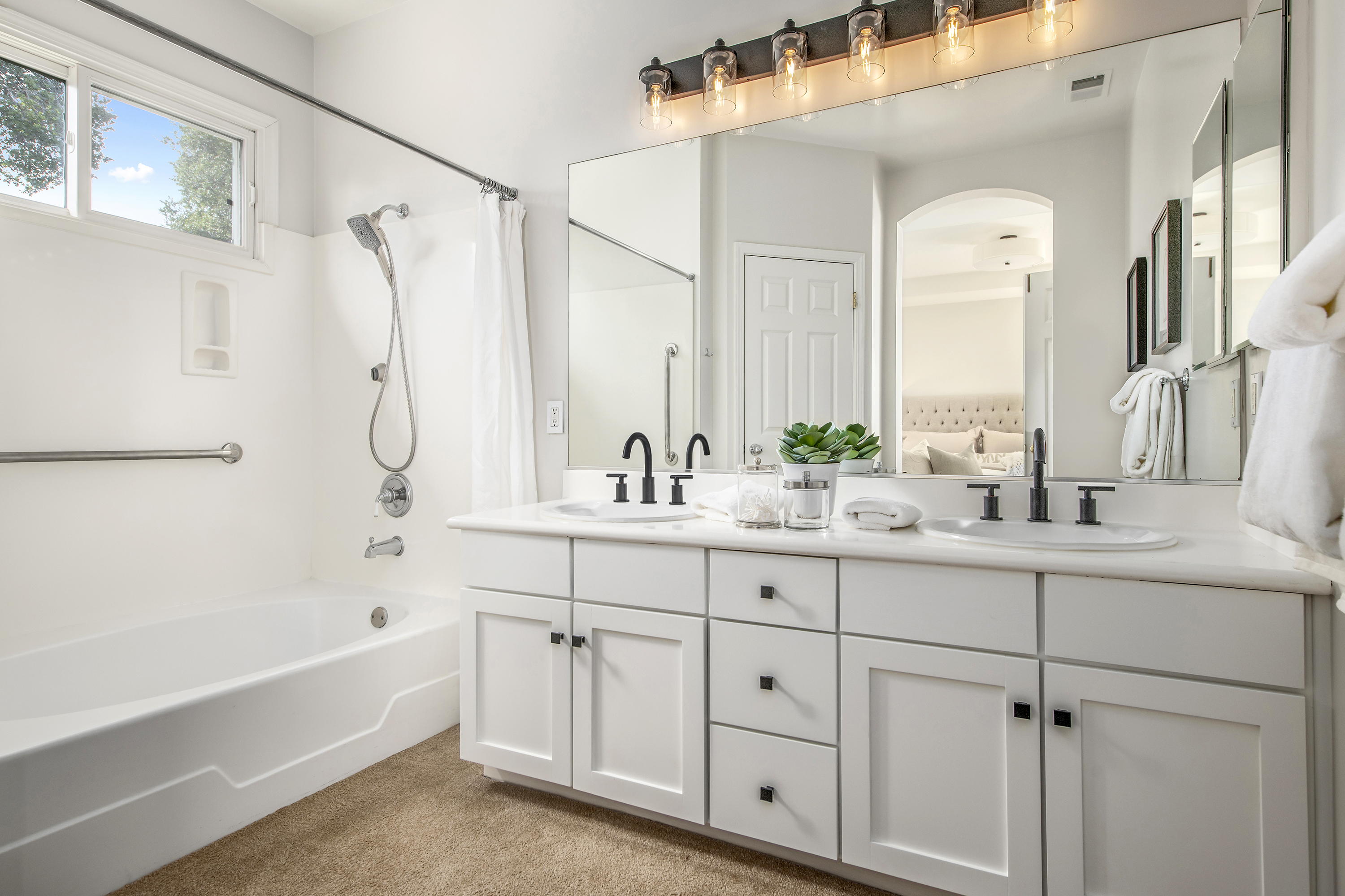 Primary Suite Retreat Features Double Sinks and Water Closet