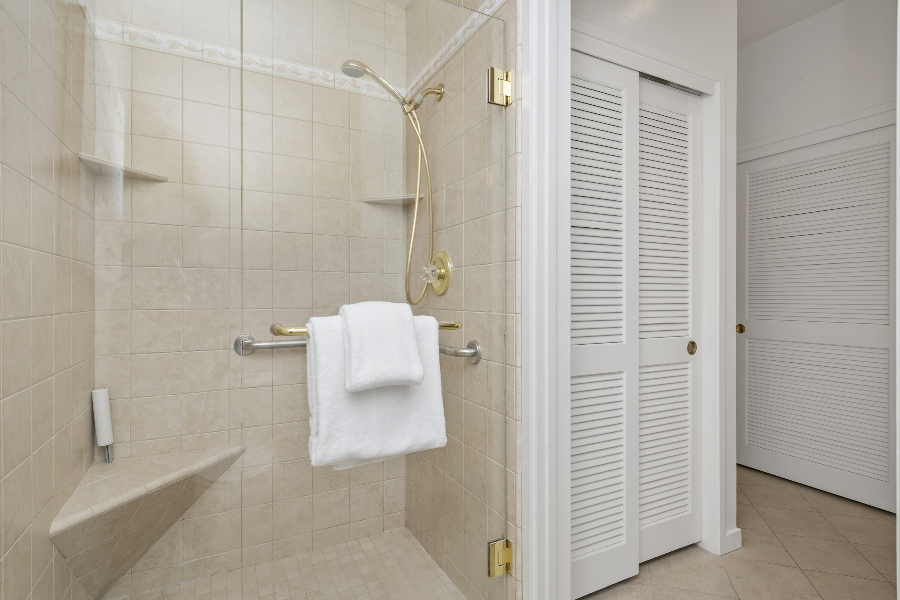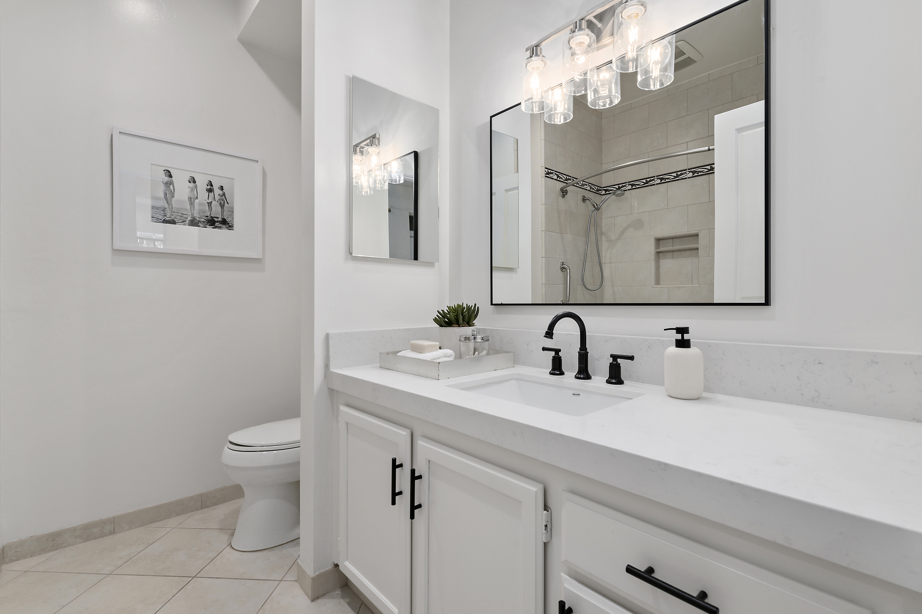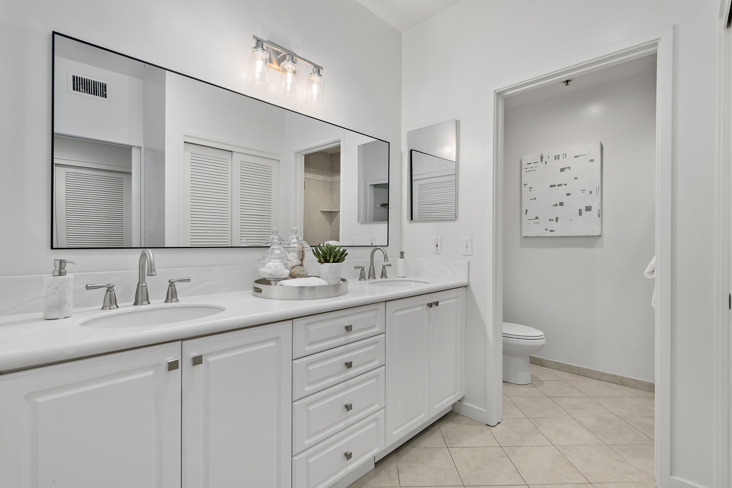 Primary Suite Retreat Features Double Sinks, Stall Shower, and Access to Backyard Patio