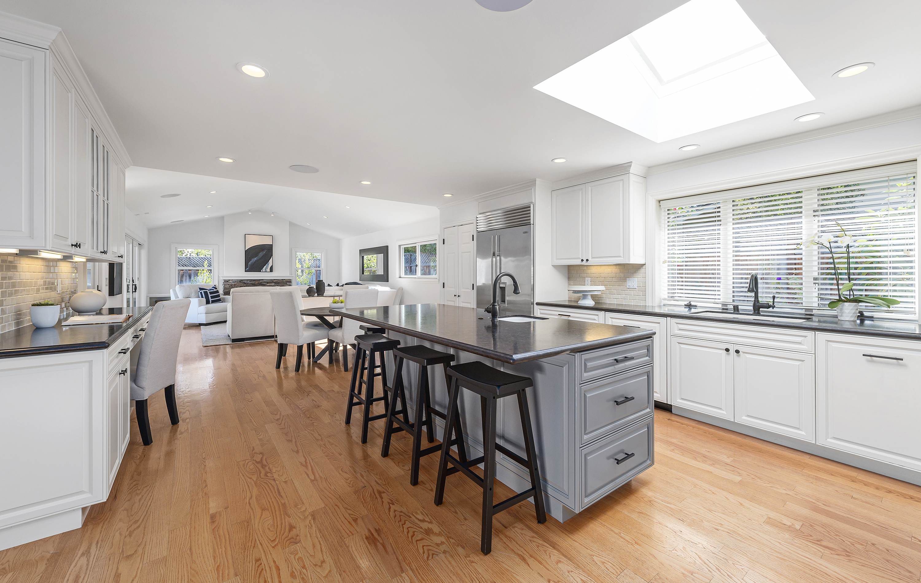 Kitchen Opens to a Spacious Family Room with Fireplace and Built-ins