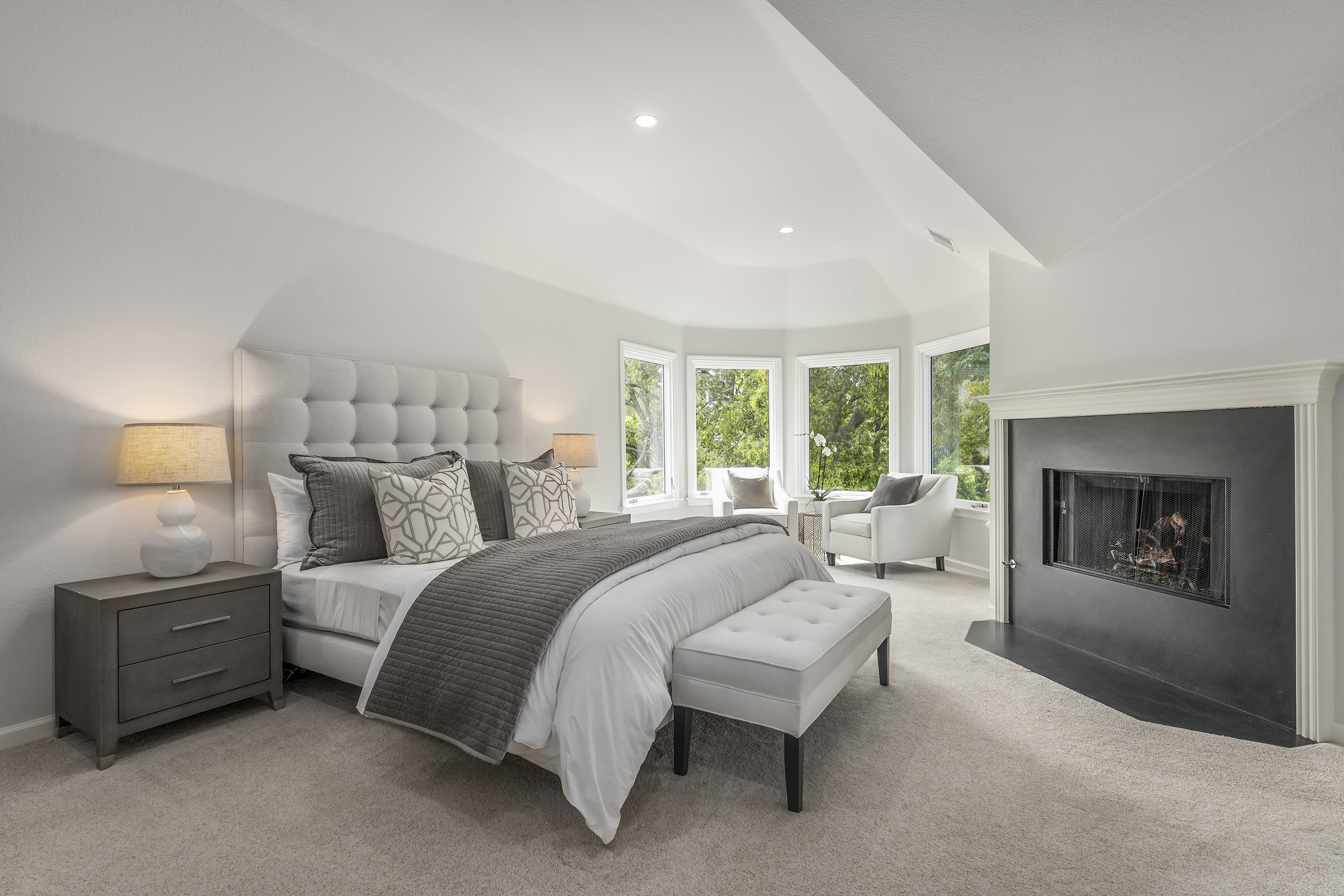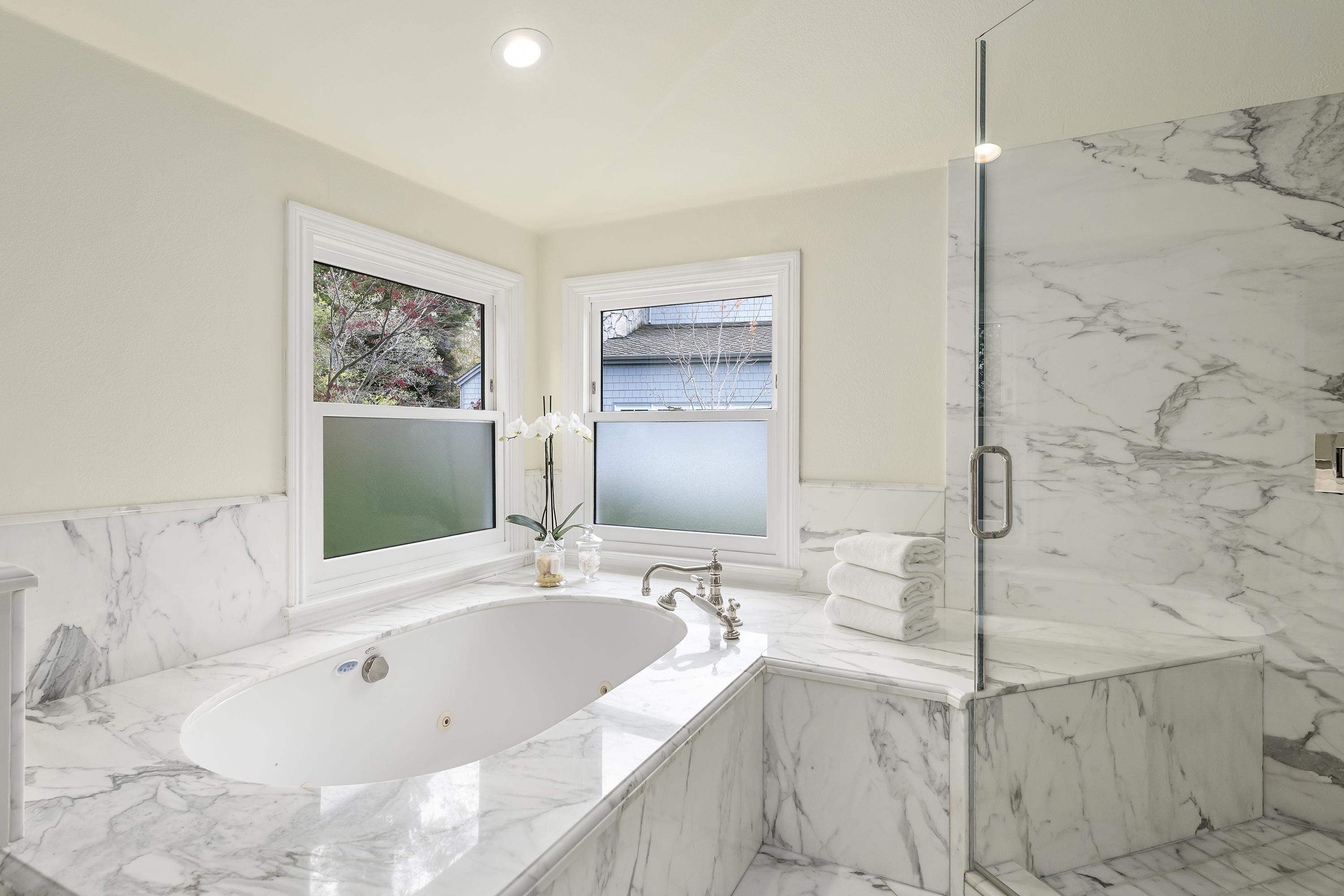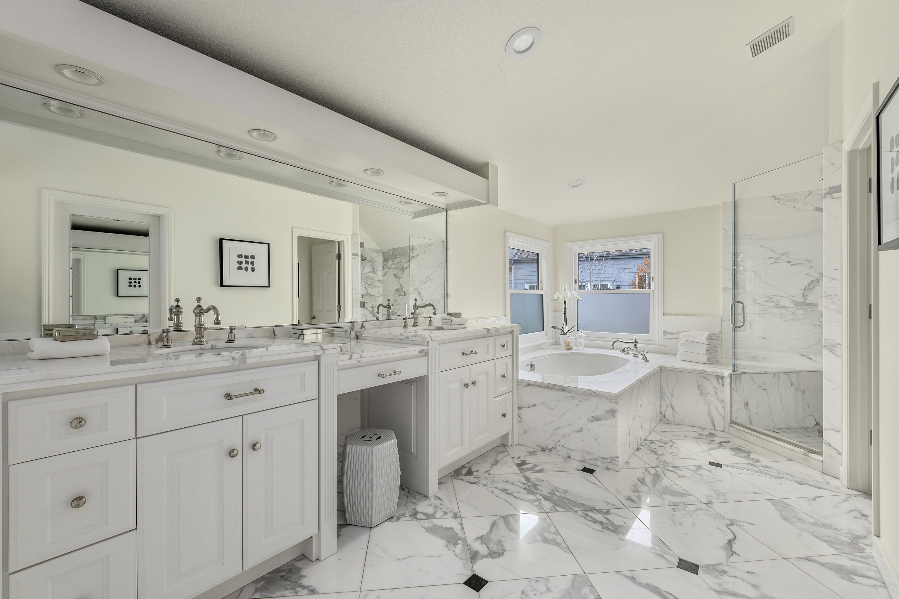 Primary Suite Retreat Features Fireplace, Double Sinks, Tub, Stall Shower, and Spacious Walk-in Closet