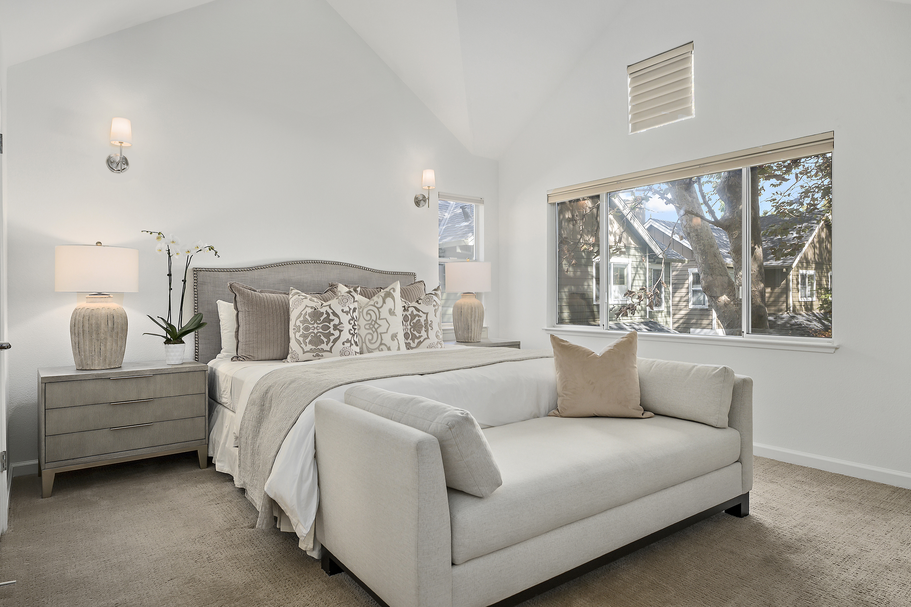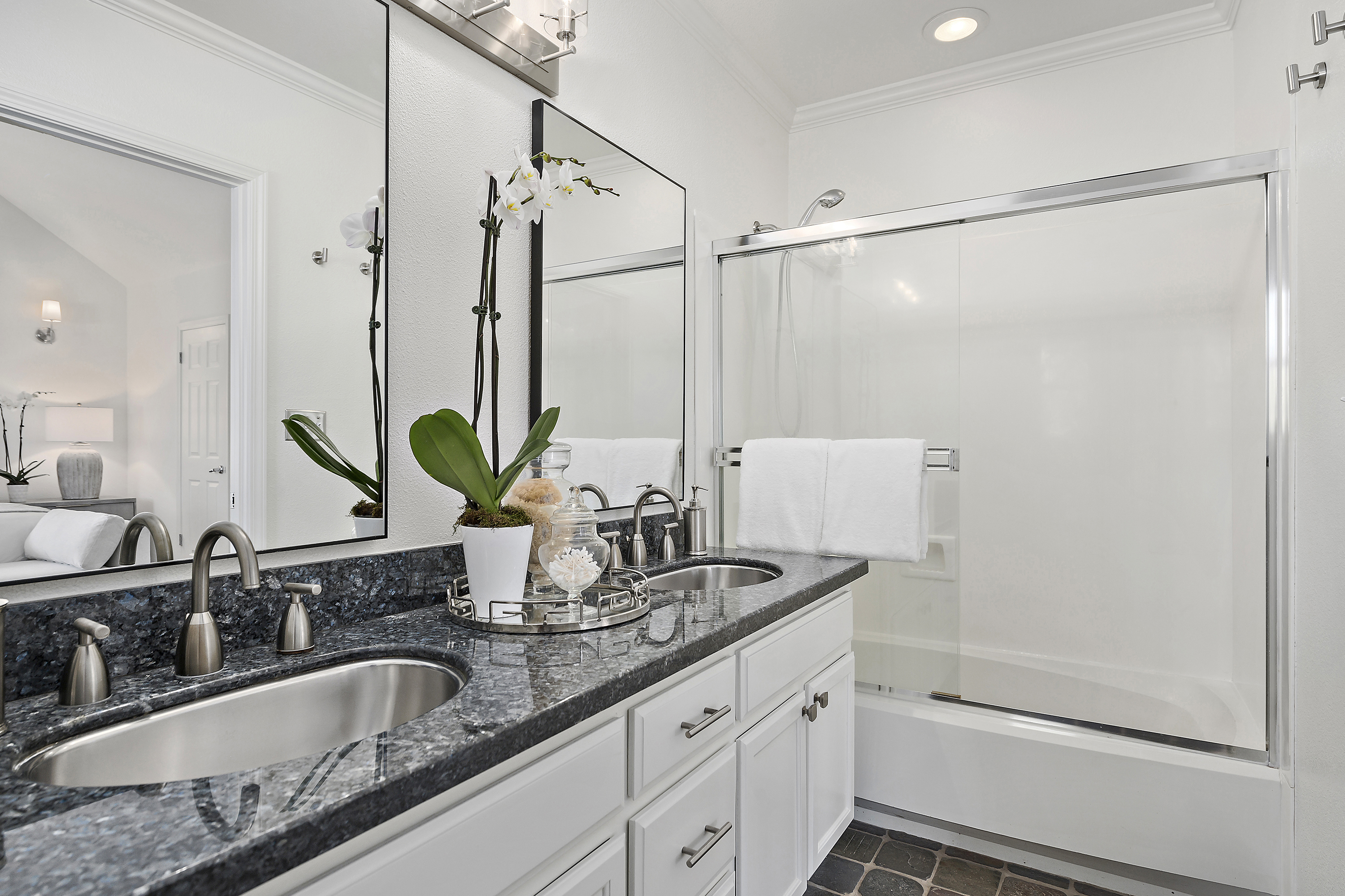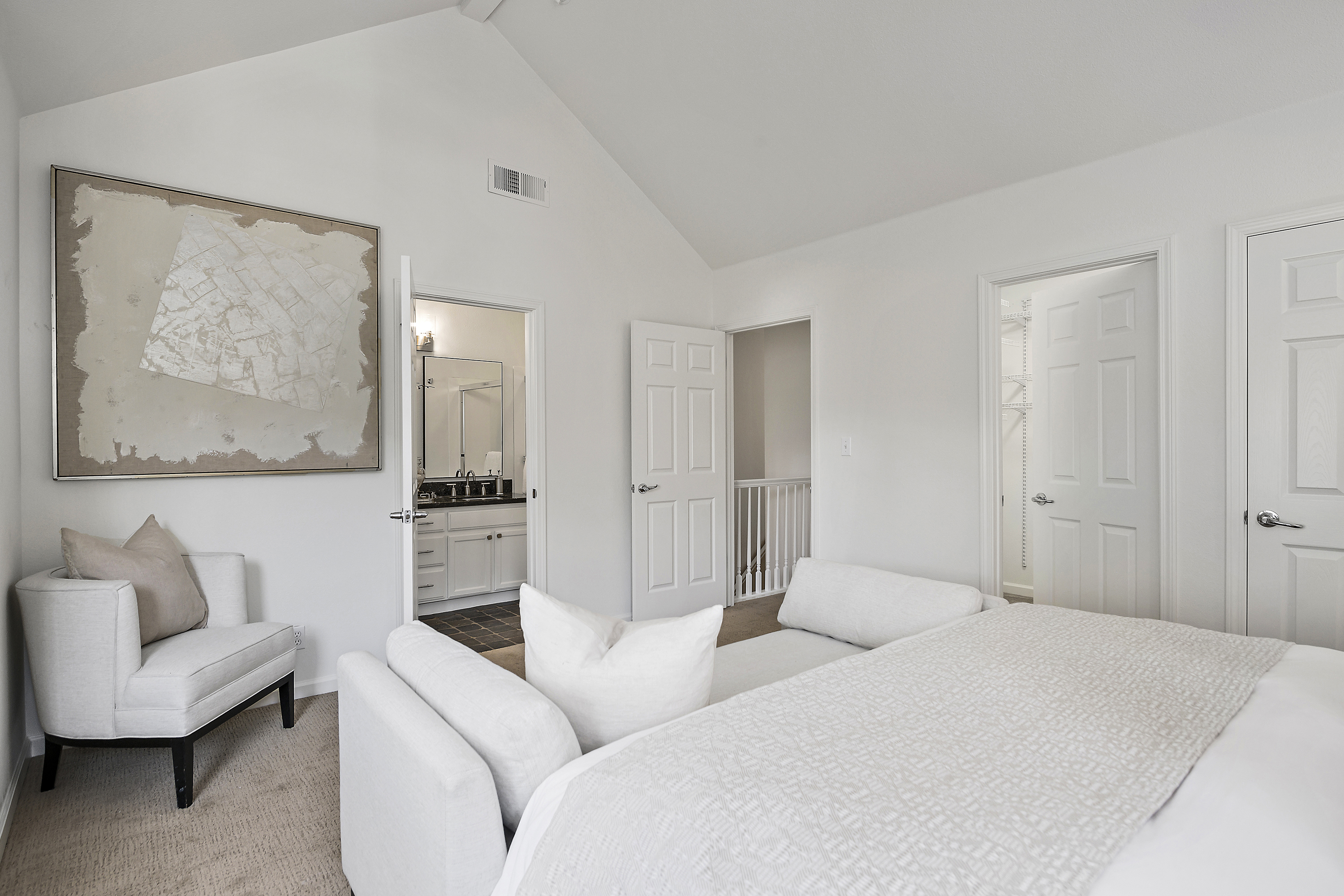 Primary Suite Retreat Features High Ceilings, Walk-in Closet, and Double Sinks