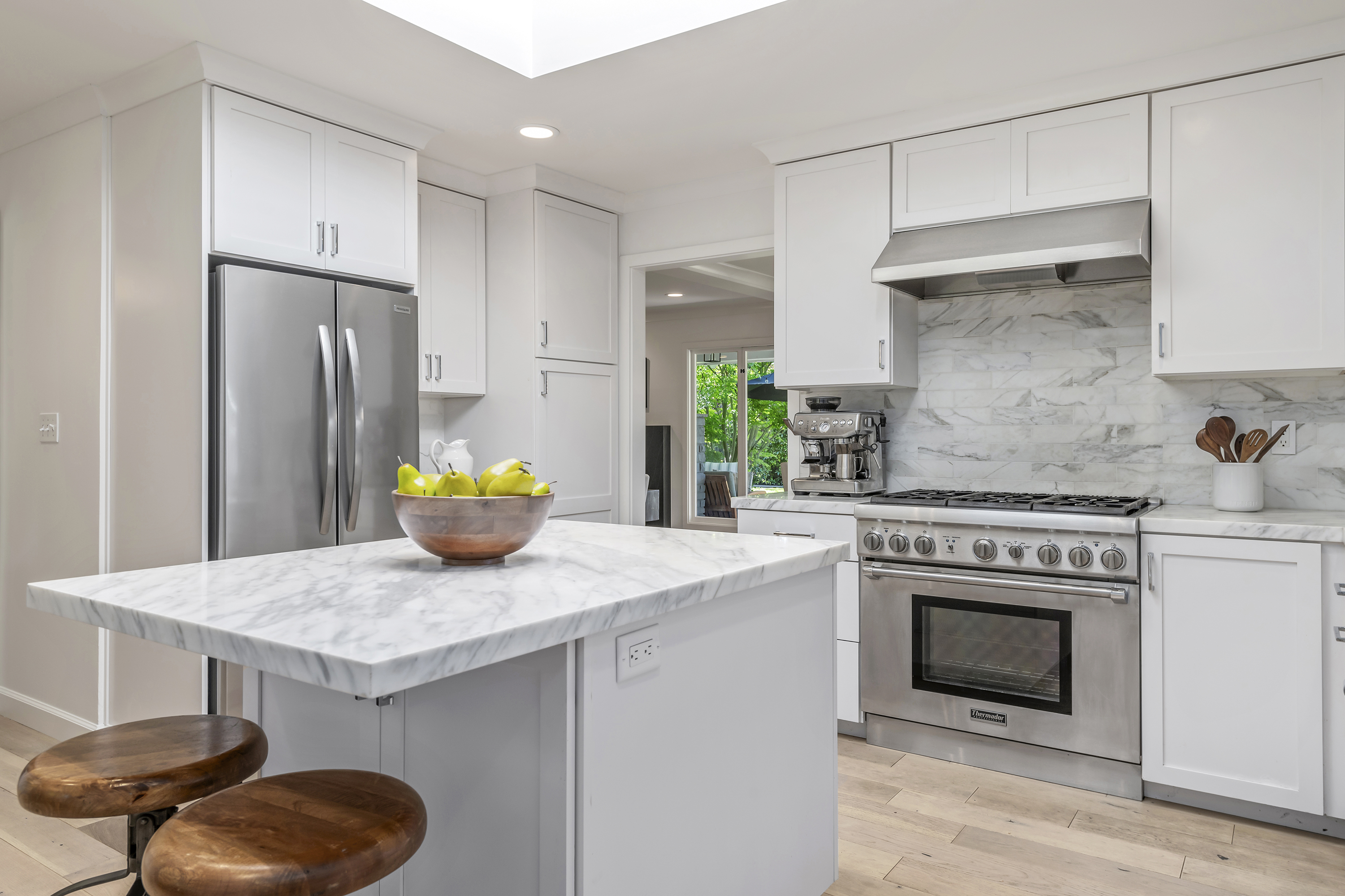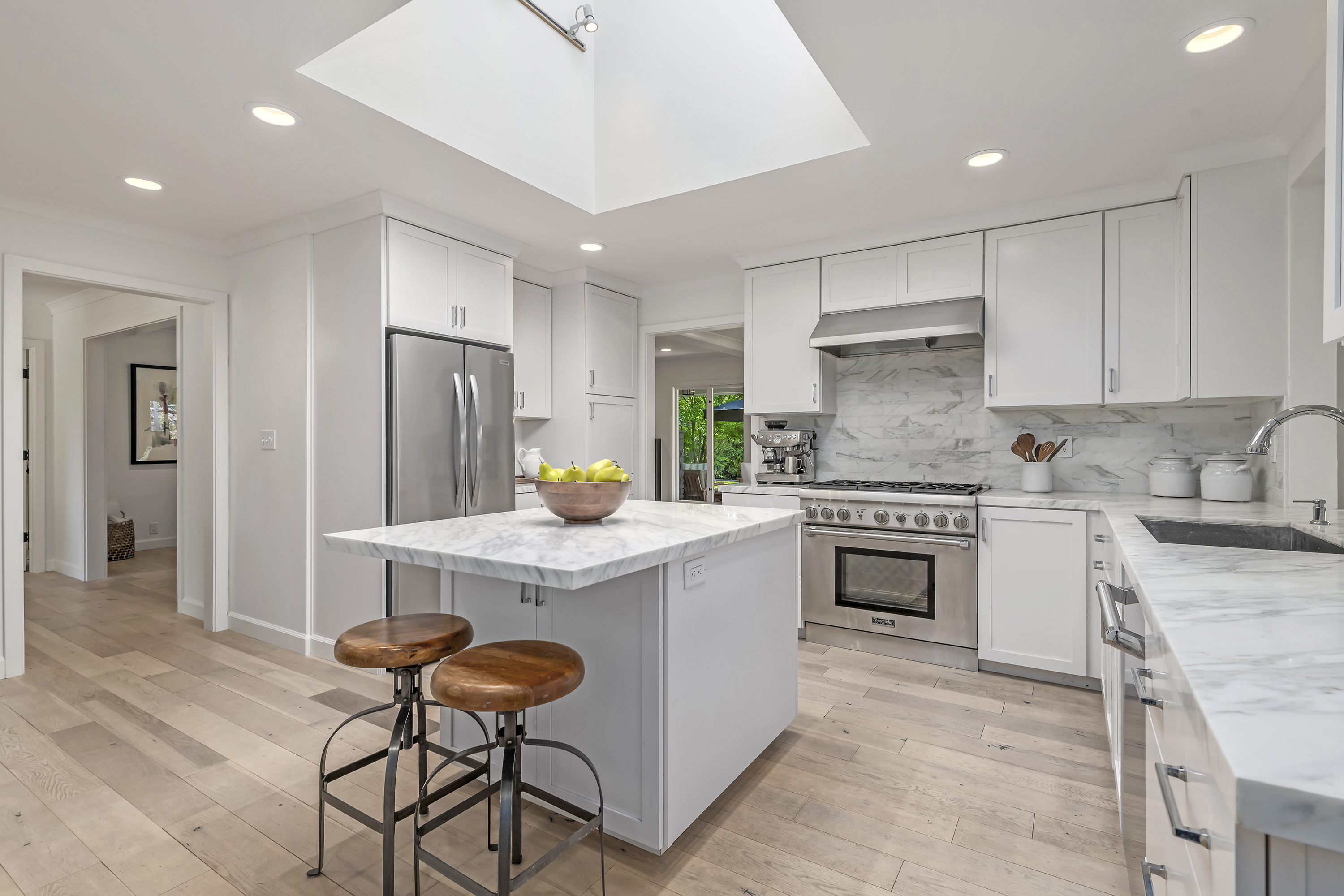 Chef's Eat-in Kitchen with Center Island, Skylight, and Wine Refrigerator