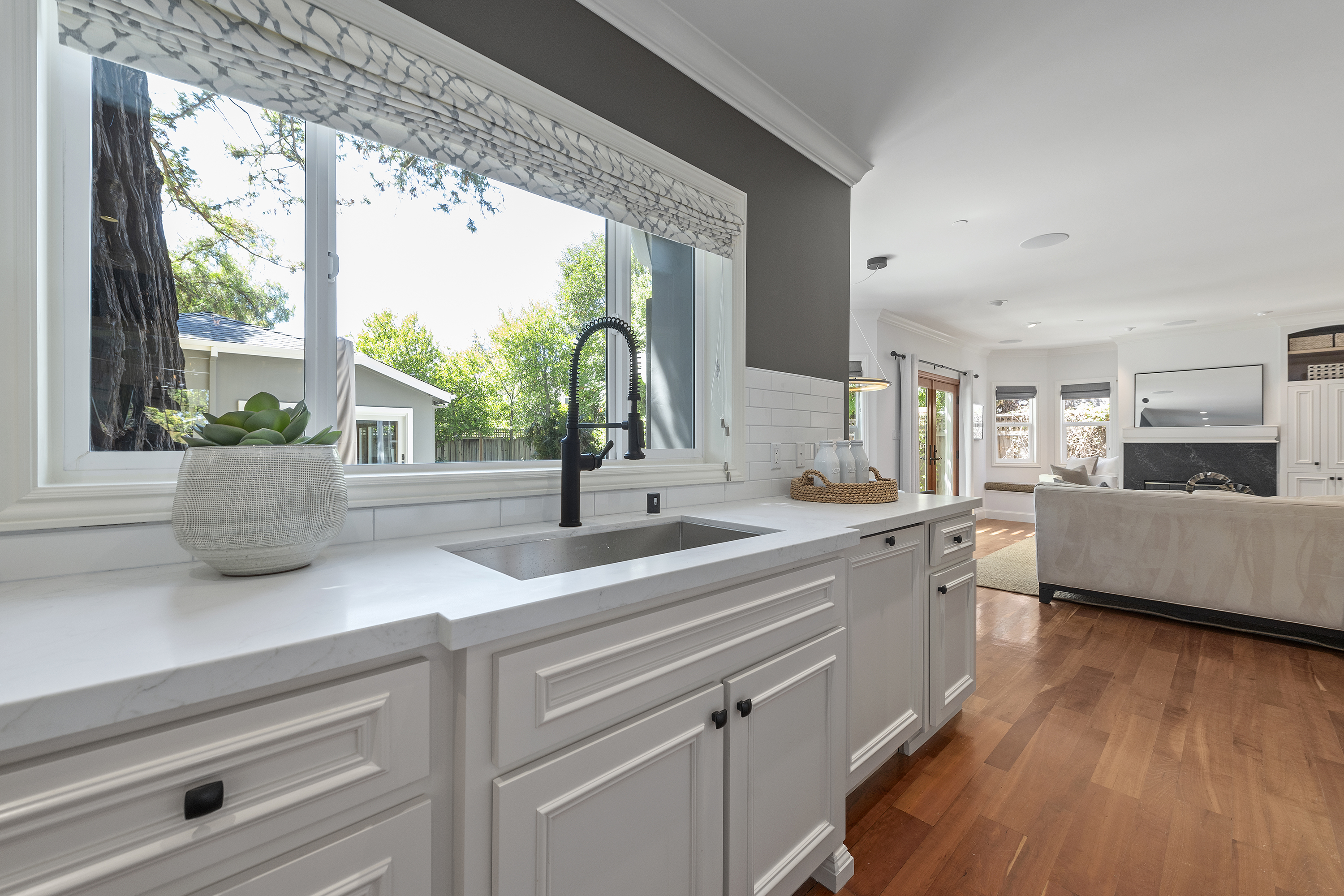 Opens to Family Room with Built-ins and Fireplace
