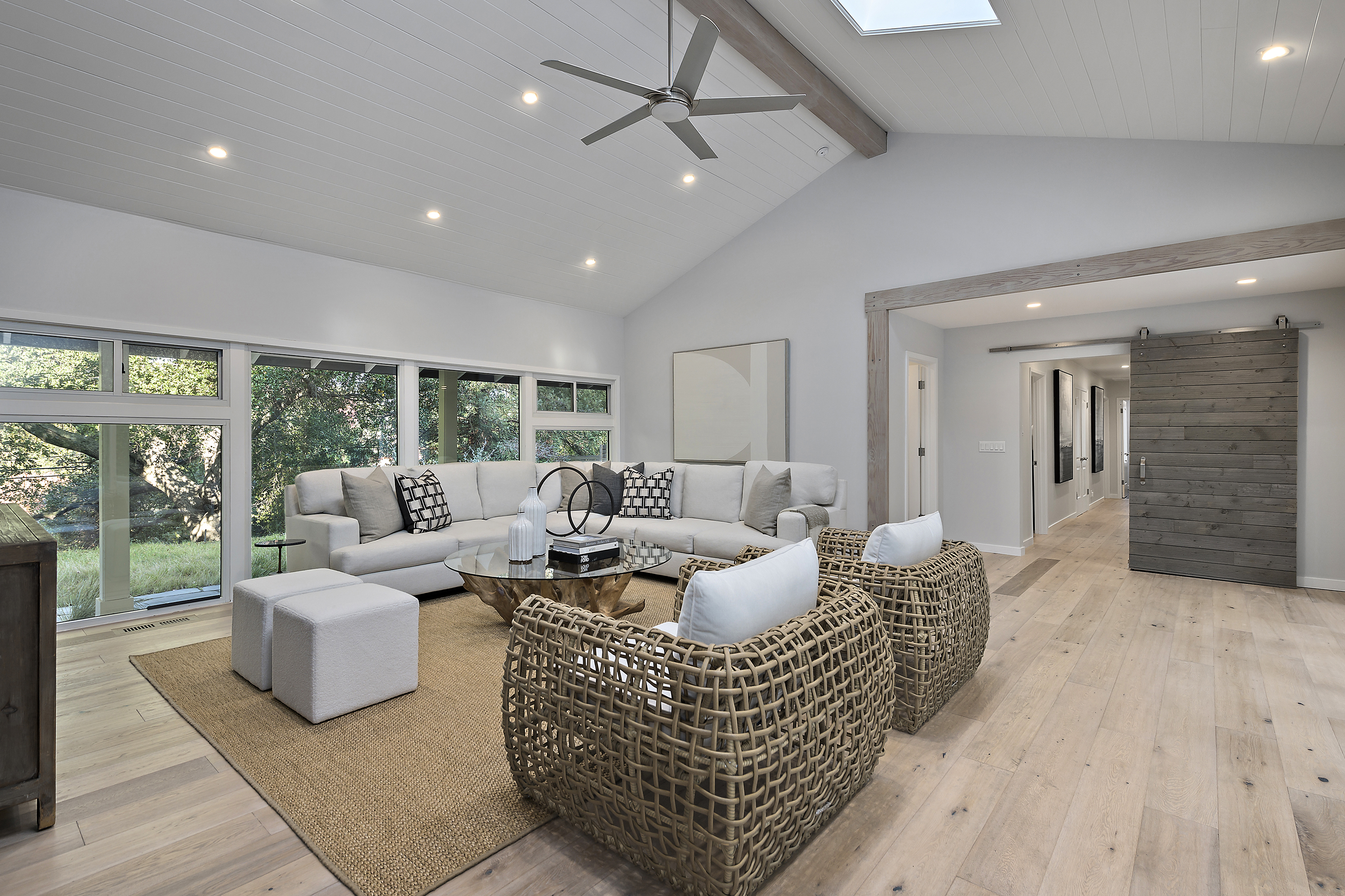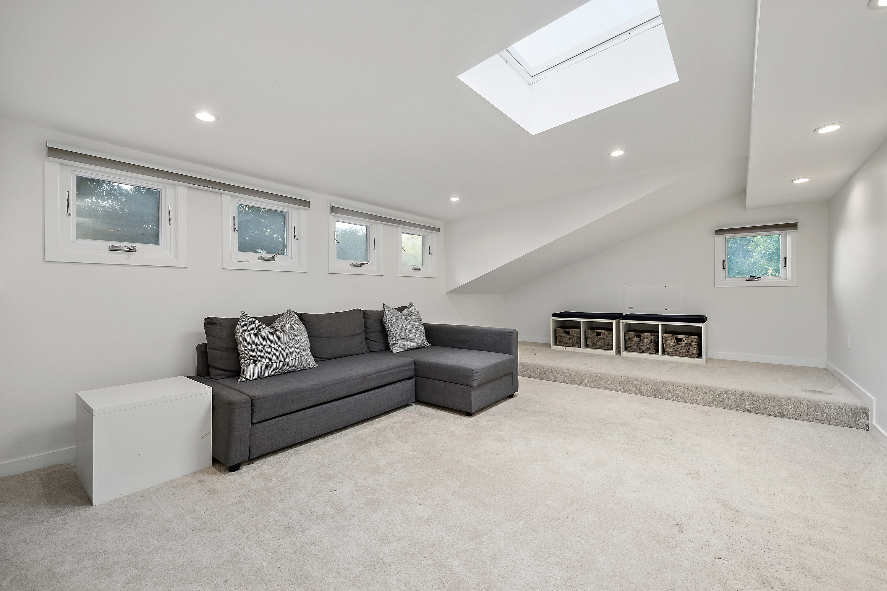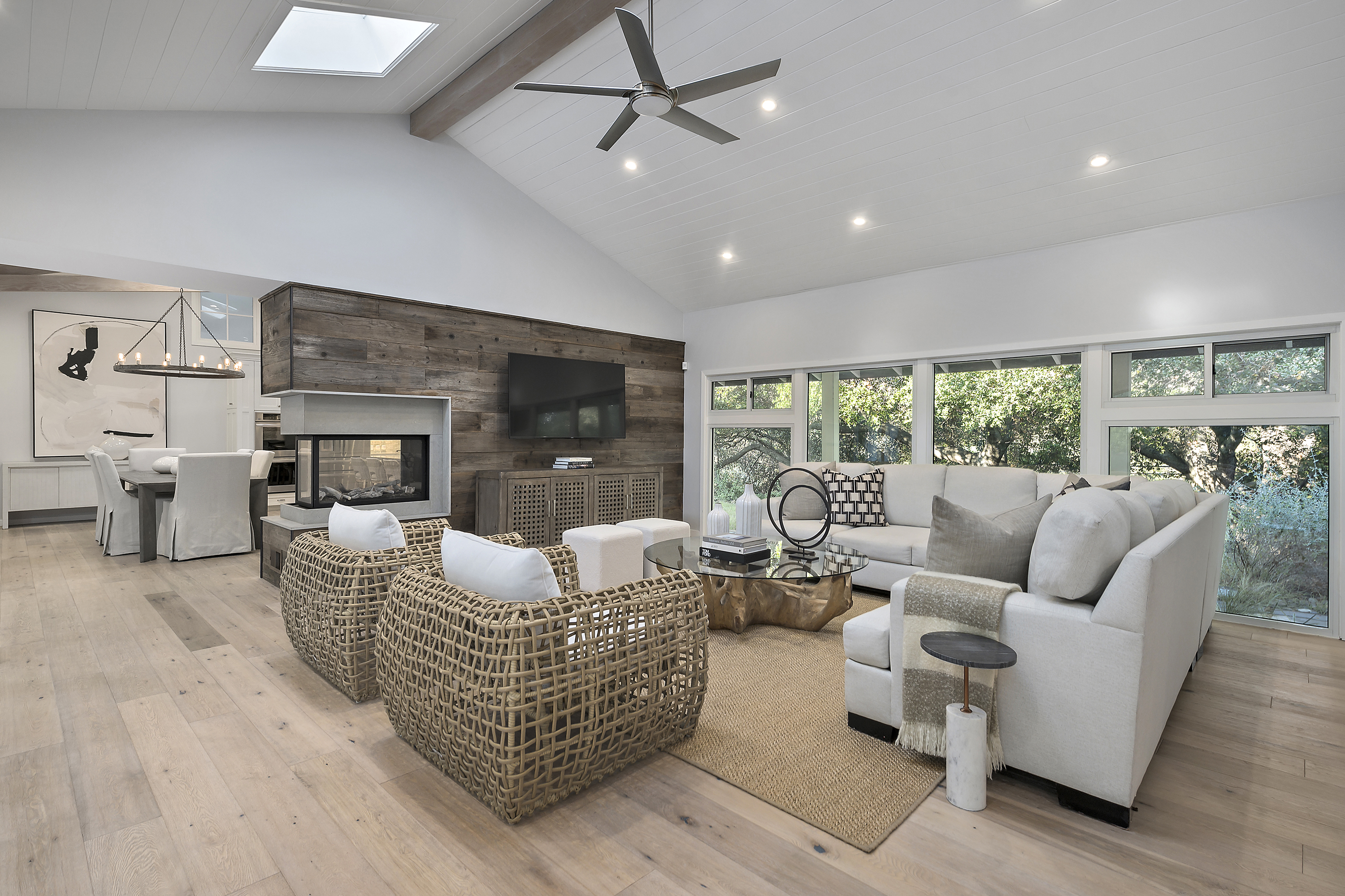 Spacious Family Room with Skylights, Vaulted Ceilings, and Fireplace