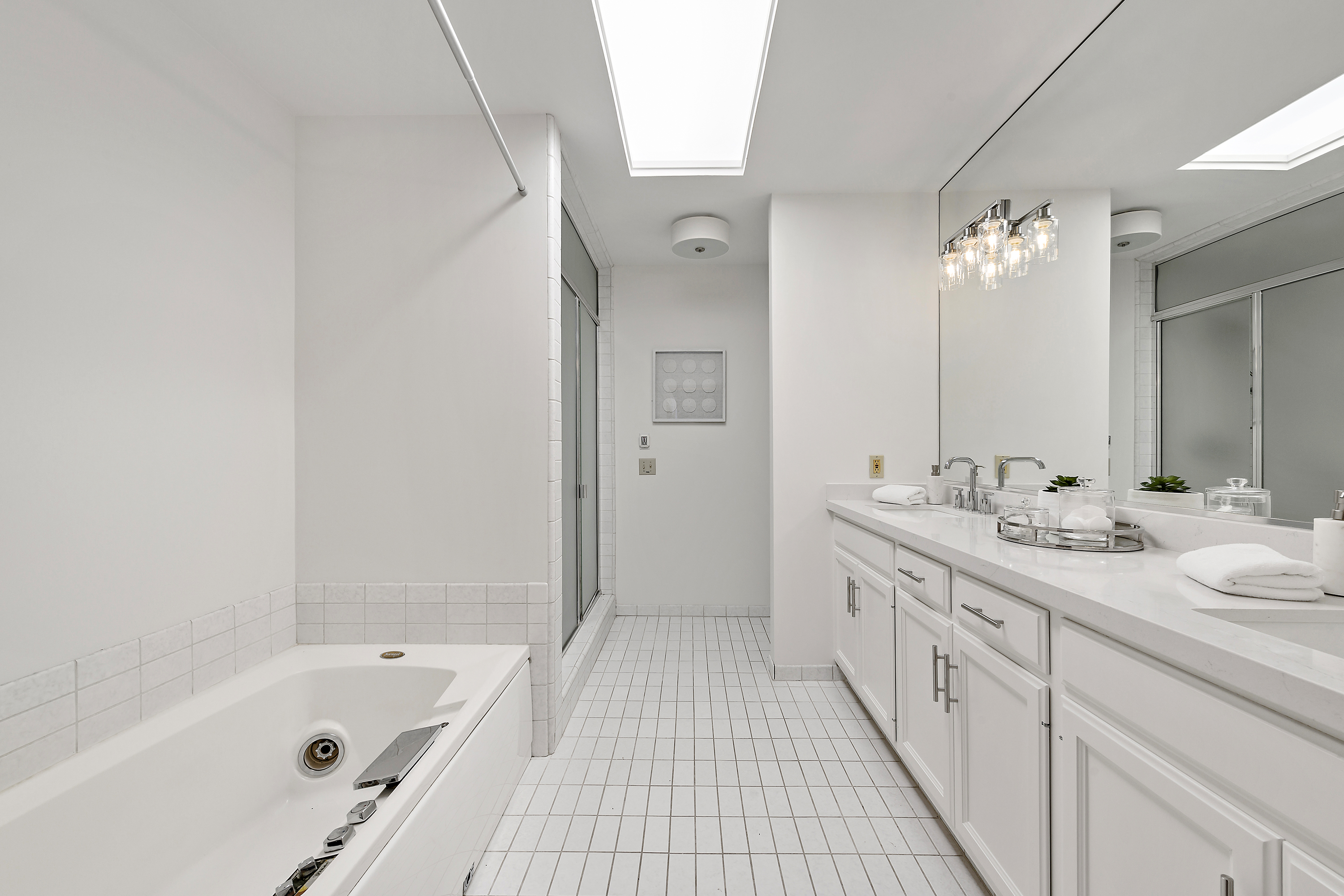 Primary Suite Retreat Features Two Closets, Double Sinks, Oversized Tub, Stall Shower, and Skylights