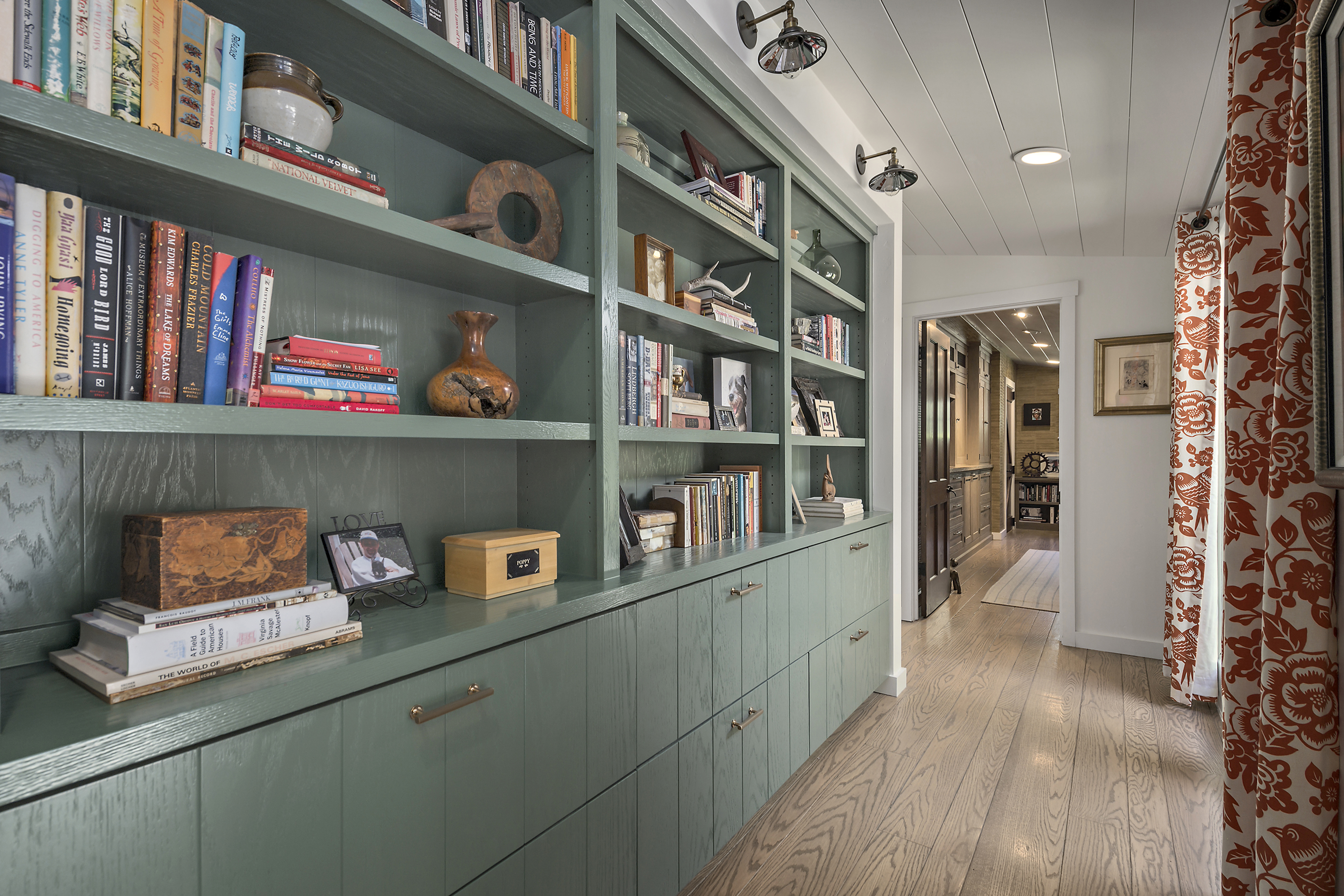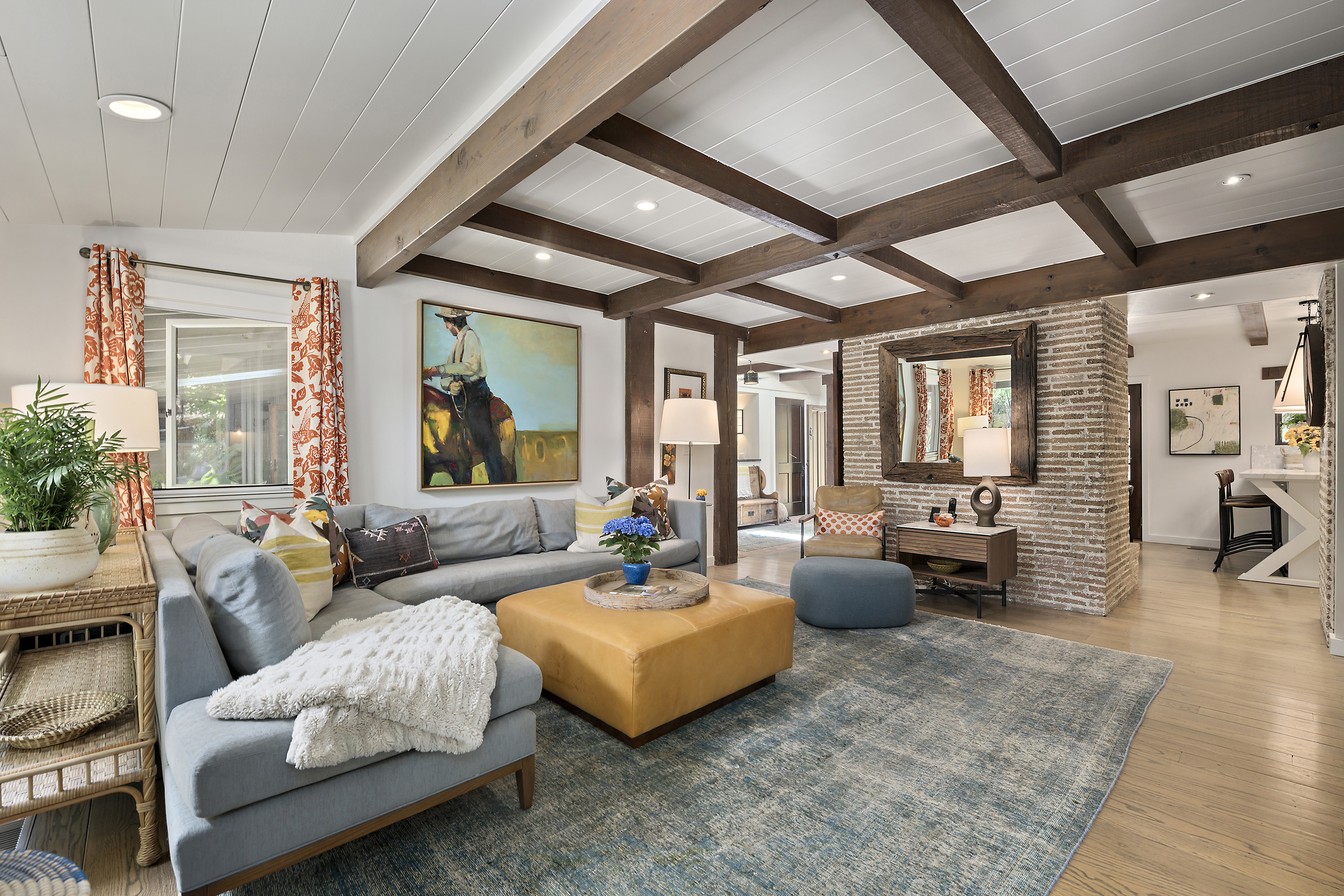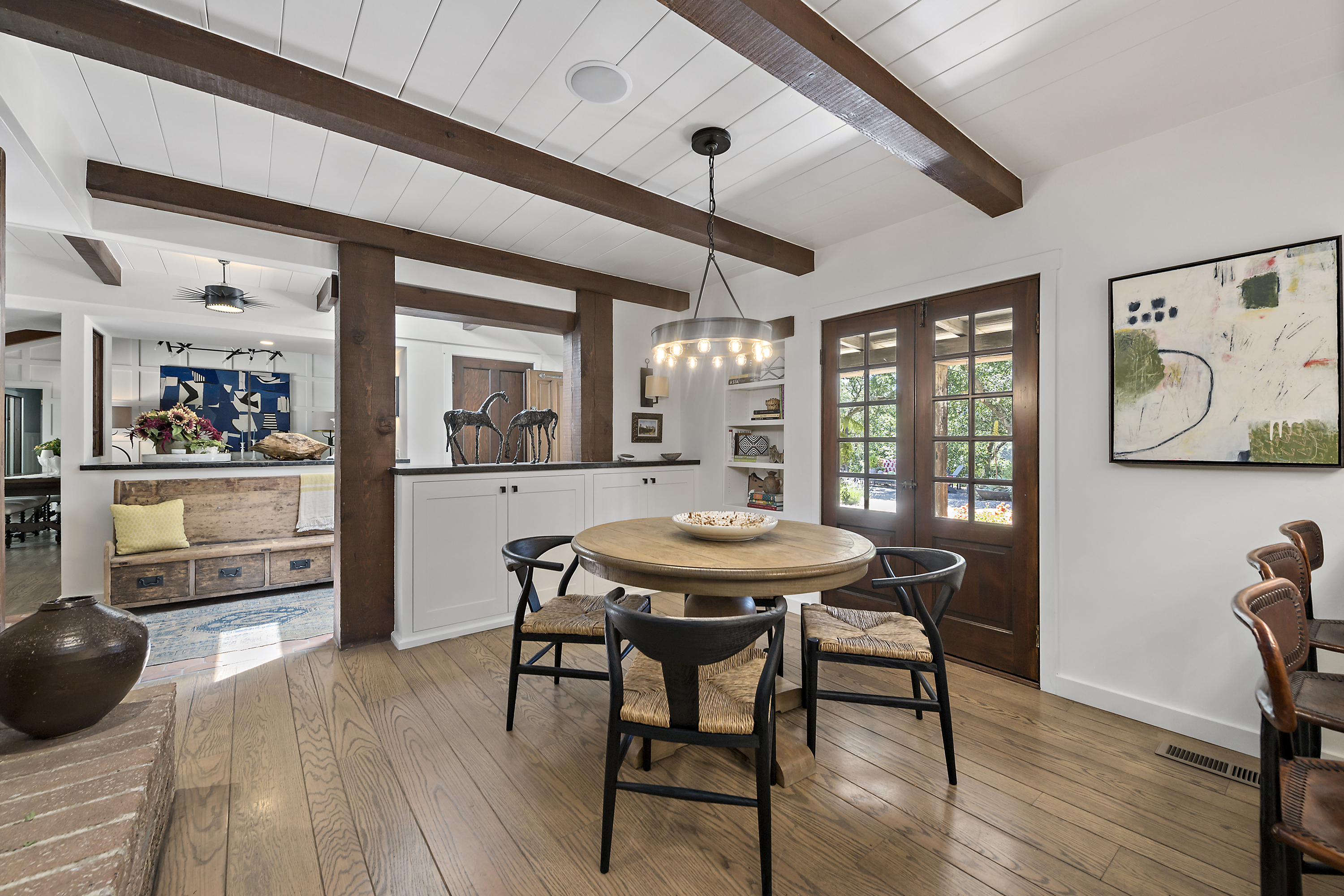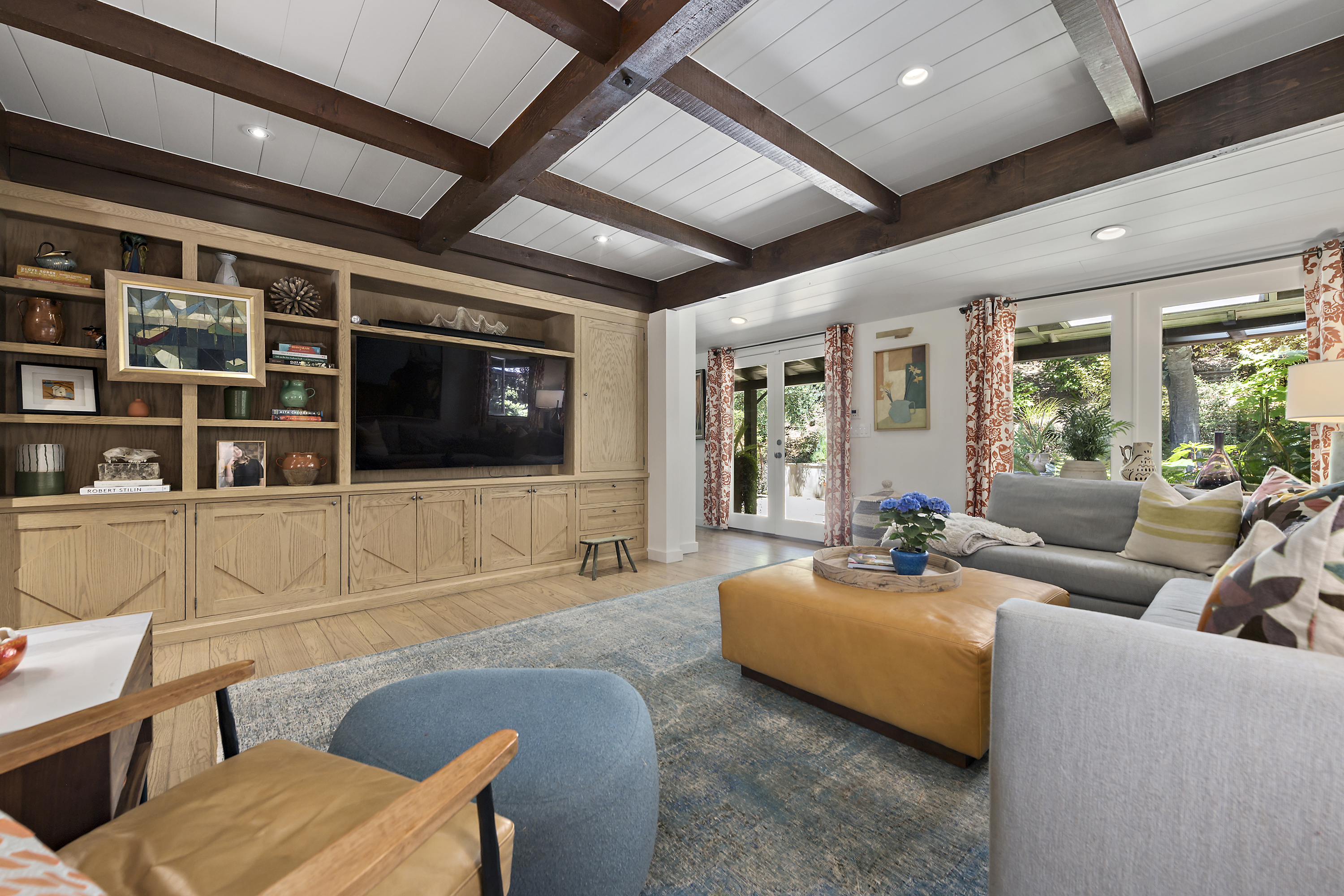 Separate Family Room with Built-in Cabinets and Boxed Beam Ceilings