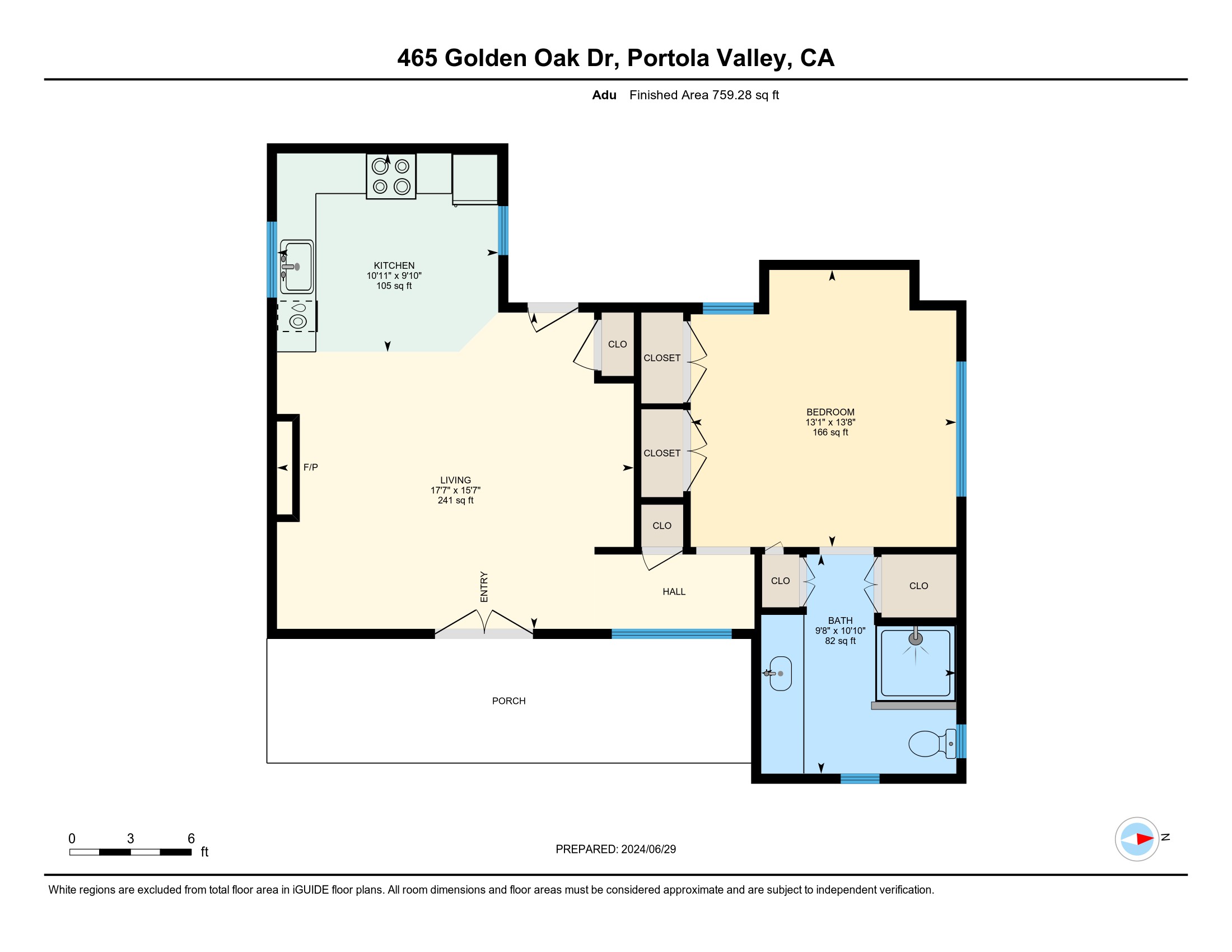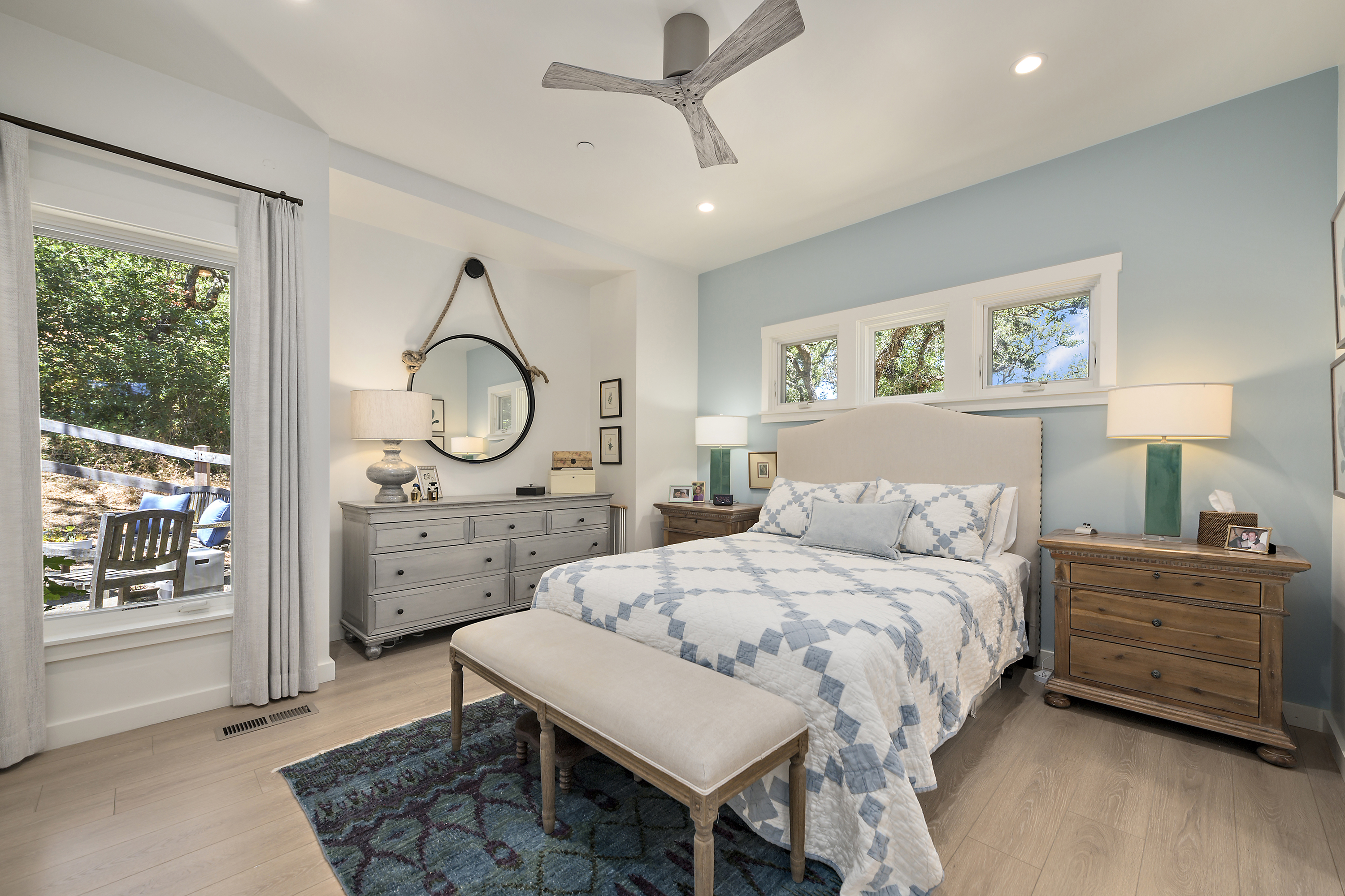 ADU Features Separate Bedroom, Full Bathroom with Shower, Kitchen, Fireplace, and Vaulted Ceilings