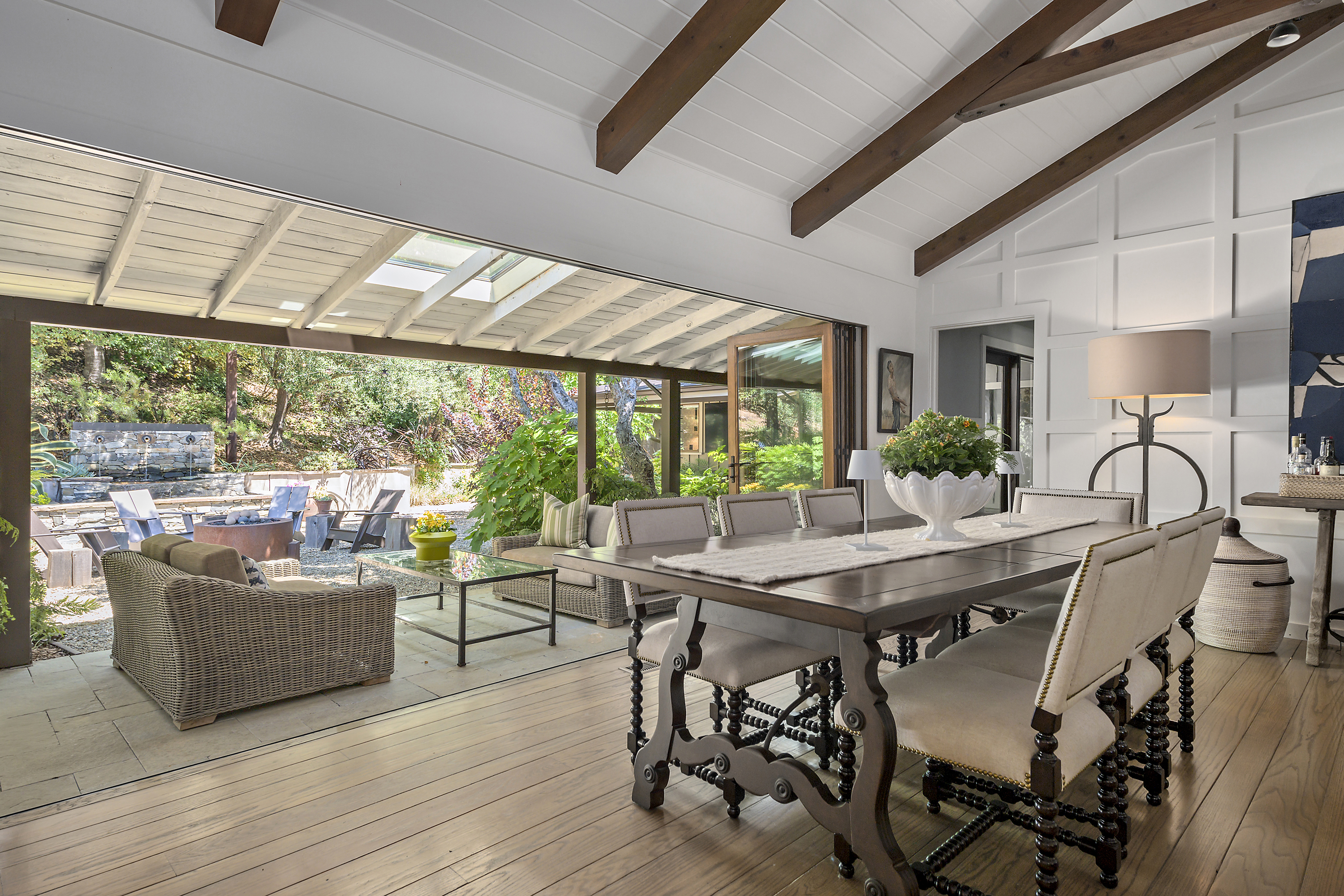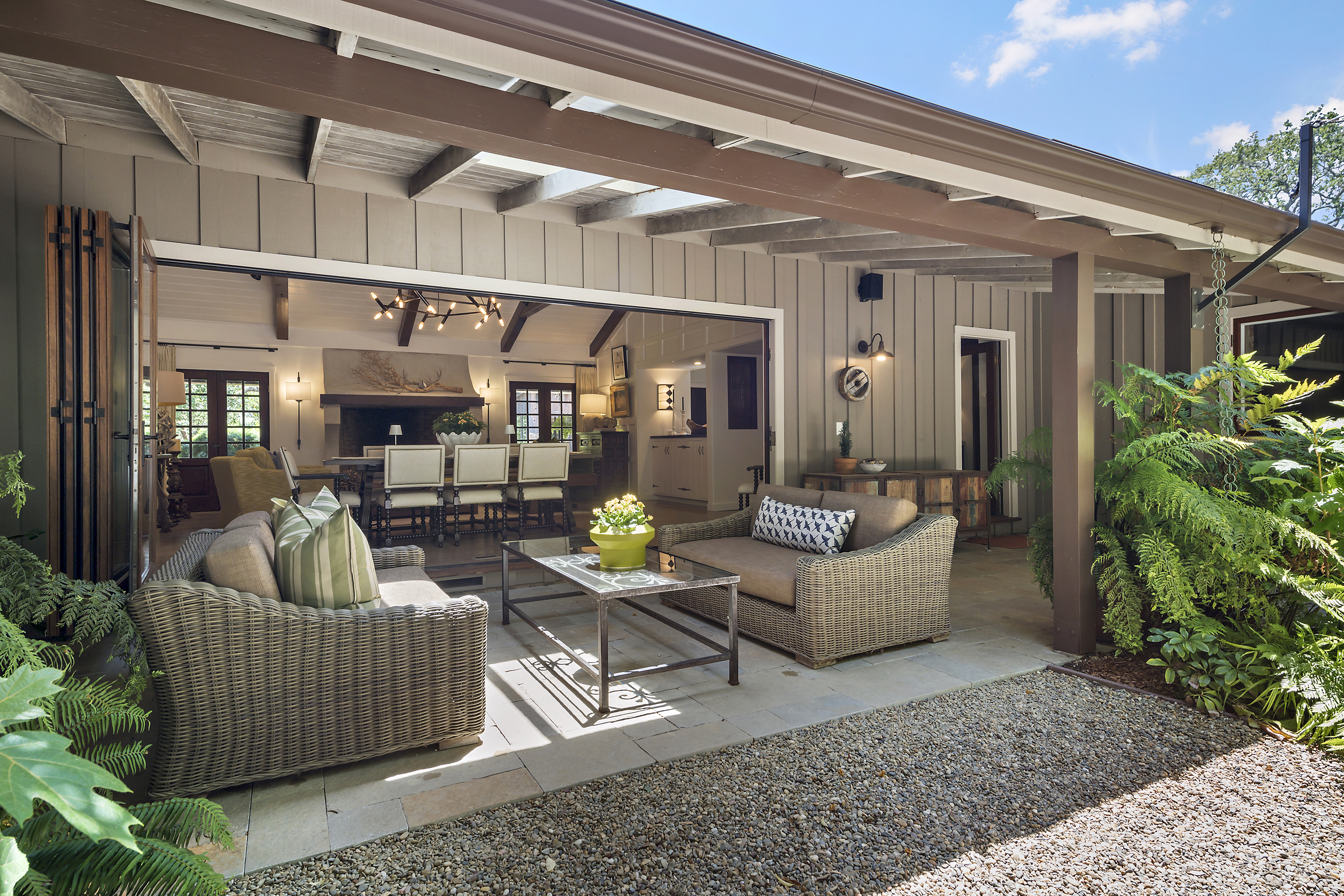 Elegant Living Room with Fireplace, Vaulted Ceilings, and Accordion Doors Opens to Covered Porch