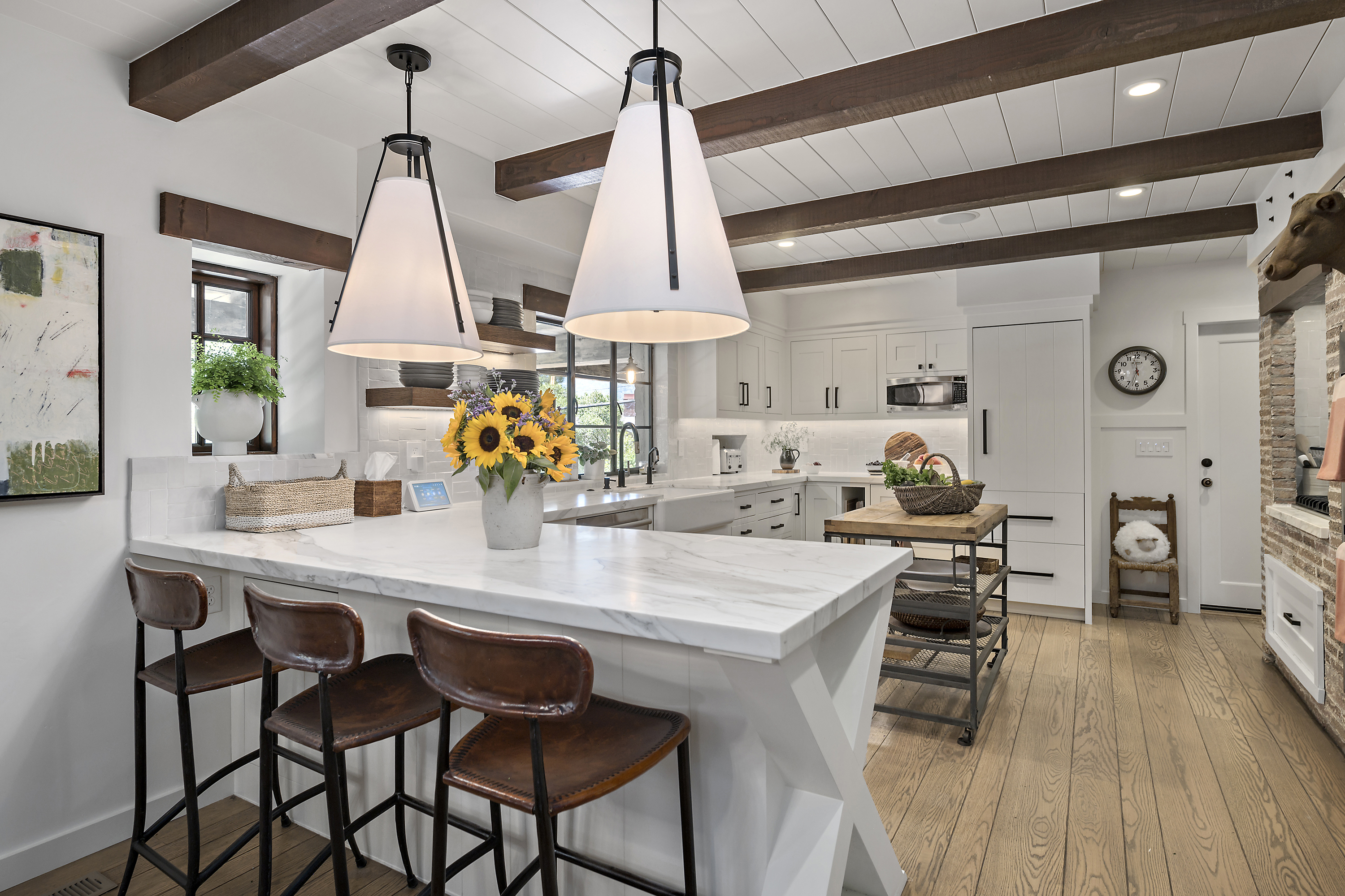 Chef's Eat-in Kitchen Features Breakfast Bar, Fireplace, and Inset Cabinetry